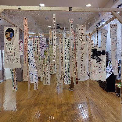 La exposición “Caminar el Cuerpo Desaparecido” se inició en 2015 a partir de un proyecto performático de la artivista Fabiola Rayas con integrantes del colectivo “Familiares Caminando Por Justicia”. El proyecto comenzó a recorrer el país con la idea de recolectar las listas de las personas desparecidas que tienen las familias y colectivos independientes, logrando recolectar información de más de 70 colectivos del país. En lo que va de los últimos 15 años ha hecho 15 exposiciones, 20 talleres, etc., ha estado en distintos estados y escuelas, y este año fueron invitadas a llevar la exposición a Chicago, donde se expuso en mayo y junio en la Casa Michoacán.