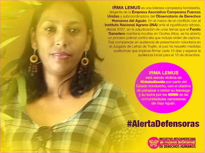 IRMA LEMUS es una lideresa campesina hondureña, dirigente de la Empresa Asociativa Campesina Fuerzas Unidas y subcoordinadora del Observatorio de Derechos Humanos del Aguán. En el marco de un conflicto con el Instituto Nacional Agrario (INA) ante el injustificado retraso, desde 2007, en la adjudicación de unas tierras que el Fondo Ganadero mantiene incultas en Ocotes Altos, se ha abierto un proceso judicial contra ella que incluye orden de captura. Tras comparecer en audiencia de presentación voluntaria en el Juzgado de Letras de Trujillo, el juez ha resuelto medidas sustitutivas que implican firmar cada 15 dias y esperar la audiencia inicial para el 10 de diciembre.