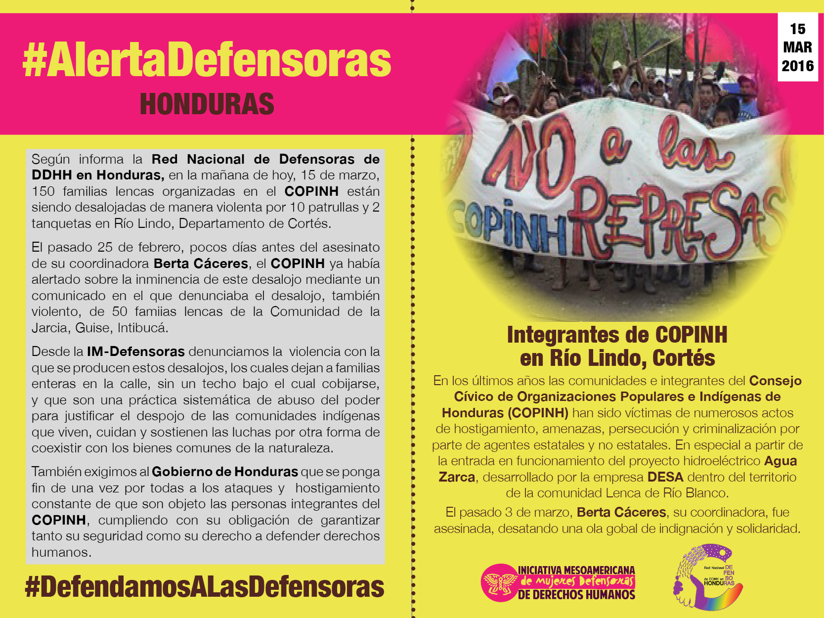 Según informa la Red Nacional de Defensoras de DDHH en Honduras, en la mañana de hoy, 15 de marzo, 150 familias lencas organizadas en el COPINH están siendo desalojadas de manera violenta por 10 patrullas y 2 tanquetas en Río Lindo, Departamento de Cortés.