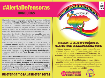 Desde la IM-Defensoras reiteramos nuestra preocupación ante la gravísima situación de riesgo que enfrentan en Honduras las personas defensoras del los derechos #LGBTTTI y, muy especialmente, las integrantes del Grupo Muñecas de la Asociación Arcoiris; asimismo exigimos al Gobierno hondureño que haga efectivo el cumplimiento de las medidas cautelares otorgadas por la CIDH a integrantes de Arcoiris, así como que se garantice la seguridad de todas las personas defensoras de la comunidad #LGBTTTI.