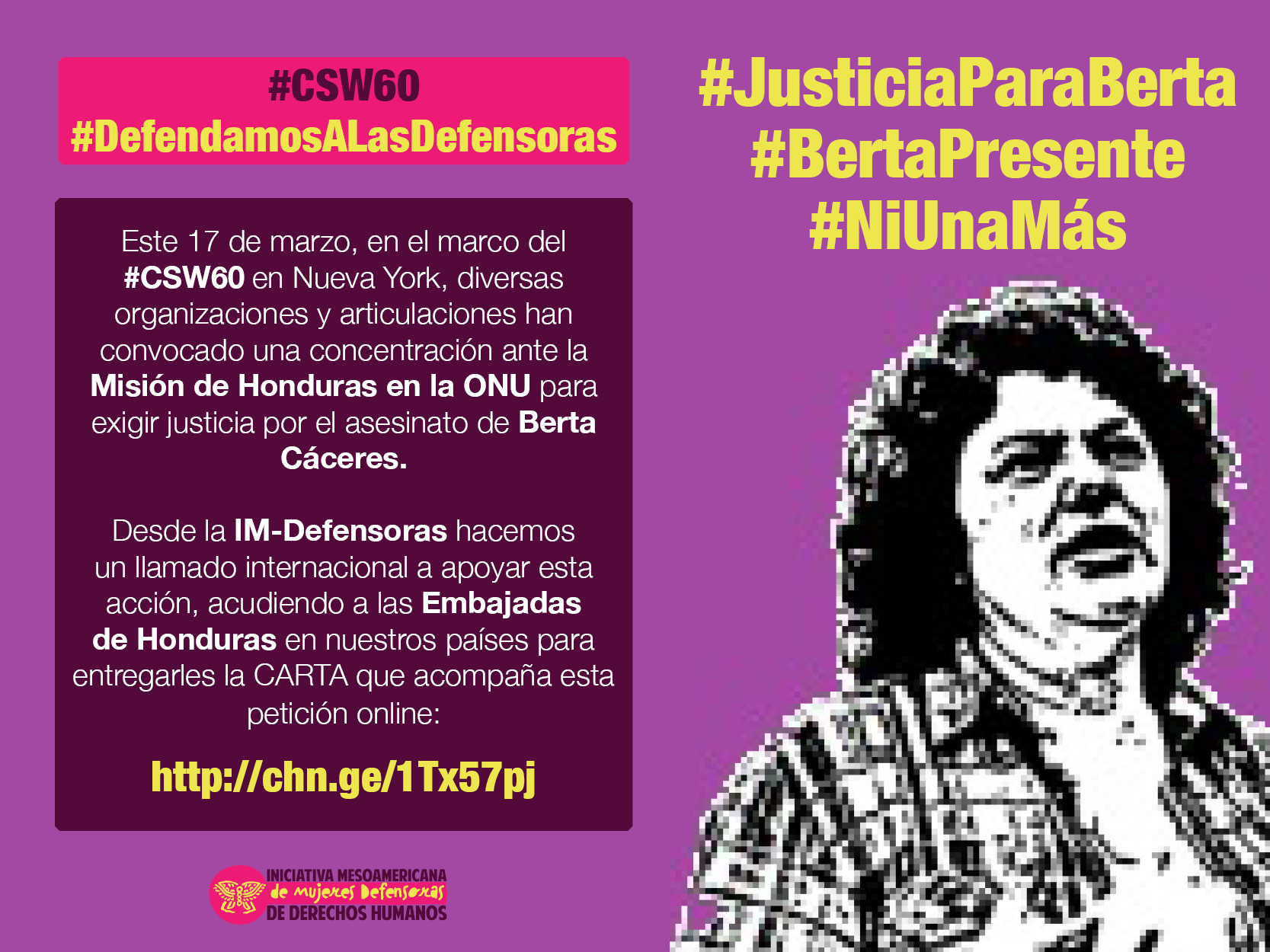Este jueves 17 de marzo, en el marco del #CSW60 en Nueva York, diversas organizaciones y articulaciones han convocado una concentración ante la Misión de Honduras en la ONU para exigir justicia por el asesinato de Berta Cáceres (adjuntamos materiales de la convocatoria para su difusión).