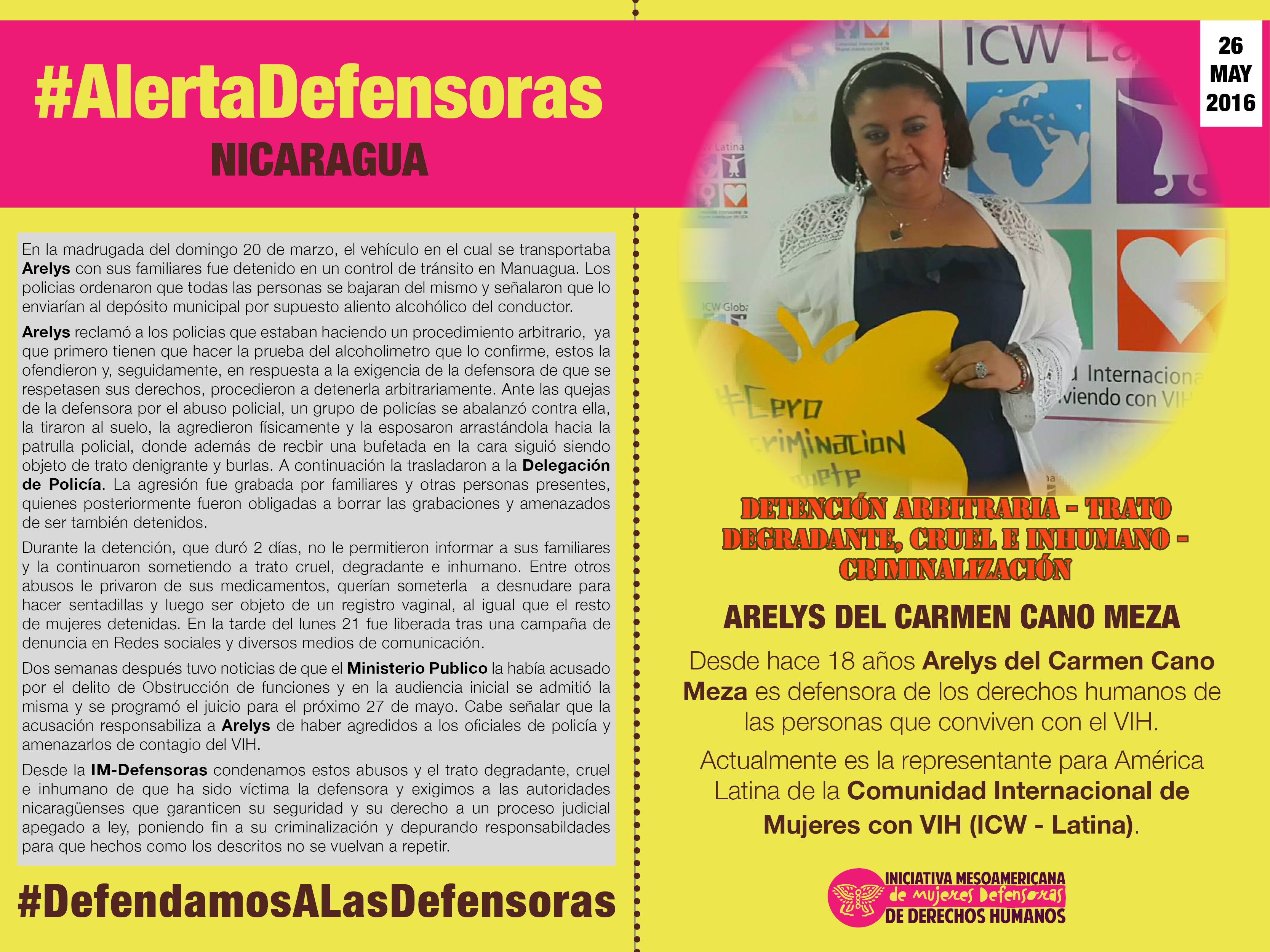 #AlertaDefensoras NICARAGUA / Detención arbitraria; trato degradante, cruel e inhumano; y criminalización contra Arelys Cano Meza