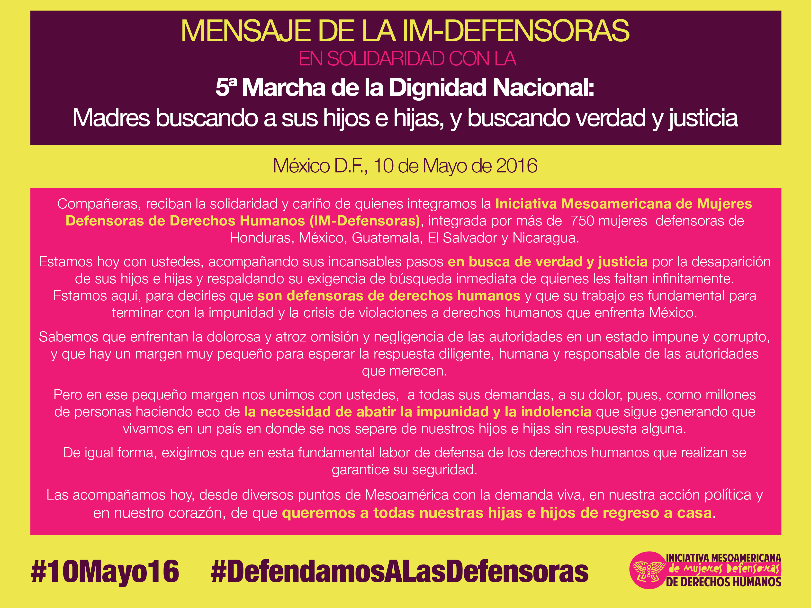 México D.F., 10 de mayo de 2016 - Compañeras, reciban la solidaridad y cariño de quienes integramos la Iniciativa Mesoamericana de Mujeres Defensoras de Derechos Humanos (IM-Defensoras), integrada por más de 750 mujeres defensoras de Honduras, México, Guatemala, El Salvador y Nicaragua.