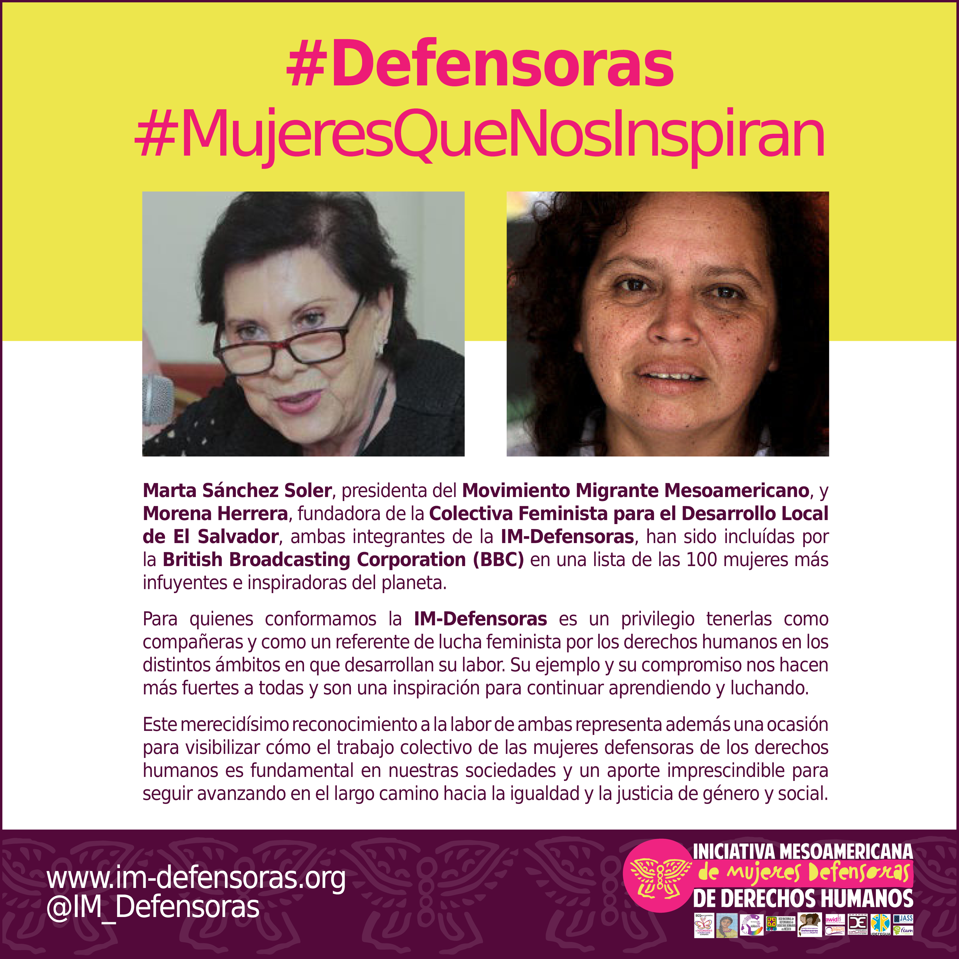 Marta Sánchez Soler, presidenta del Movimiento Migrante Mesoamericano, y Morena Herrera, fundadora de la Colectiva Feminista para el Desarrollo Local de El Salvador, ambas integrantes de la IM-Defensoras, han sido incluídas por la British Broadcasting Corporation (BBC) en una lista de las 100 mujeres más infuyentes e inspiradoras del planeta.