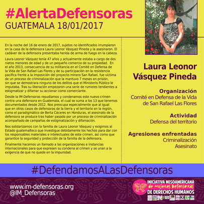 Laura Leonor Vázquez tenía 47 años y actualmente estaba a cargo de dos nietos menores de edad y de un pequeño comercio de su propiedad. En el año 2013, consecuencia de su militancia en el Comité en Defensa de la Vida de San Rafael Las Flores y de su participación en la resistencia pacífica frente a la imposición del proyecto minero San Rafael, fue víctima de un proceso de criminalización que la mantuvo 7 meses en prisión, sin que se demostrara ninguno de los delitos que el Ministerio Público le imputaba. Tras su liberación empezaron una serie de rumores tendientes a estigmatizar y difamar su accionar como comerciante.