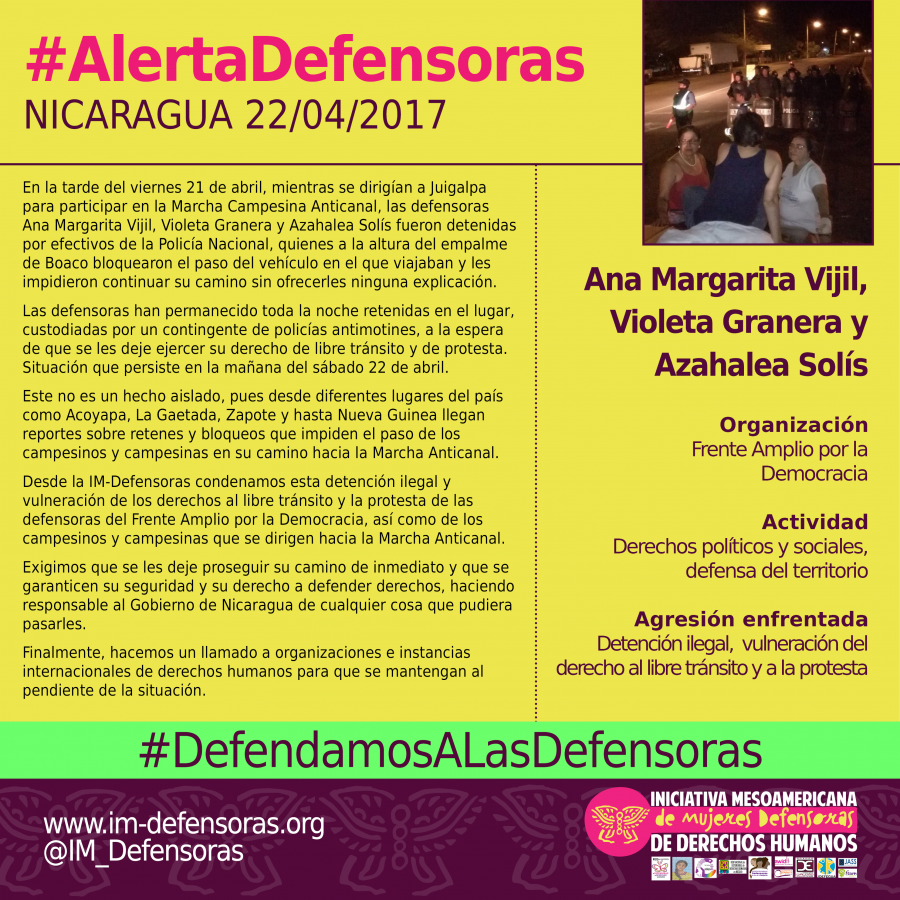 HECHOS - En la tarde del viernes 21 de abril, mientras se dirigían a Juigalpa para participar en la Marcha Campesina Anticanal, las defensoras Ana Margarita Vijil, Violeta Granera y Azahalea Solís fueron detenidas por efectivos de la Policía Nacional, quienes a la altura del empalme de Boaco bloquearon el paso del vehículo en el que viajaban y les impidieron continuar su camino sin ofrecerles ninguna explicación.