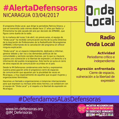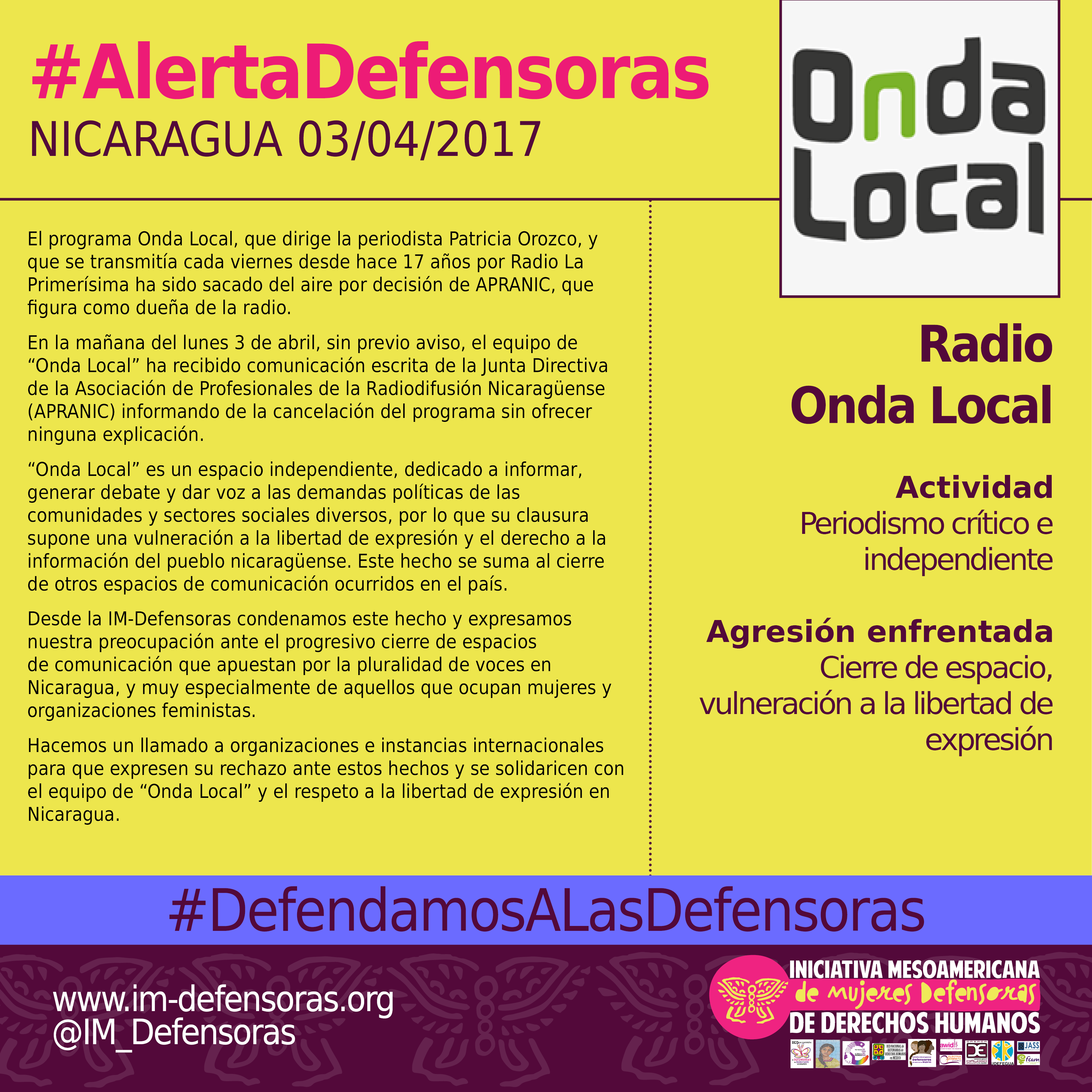 “Onda Local” es un espacio independiente, dedicado a informar, generar debate y dar voz a las demandas políticas de las comunidades y sectores sociales diversos, por lo que su clausura supone una vulneración a la libertad de expresión y el derecho a la información del pueblo nicaragüense. Este hecho se suma al cierre de otros espacios de comunicación ocurridos en el país.
