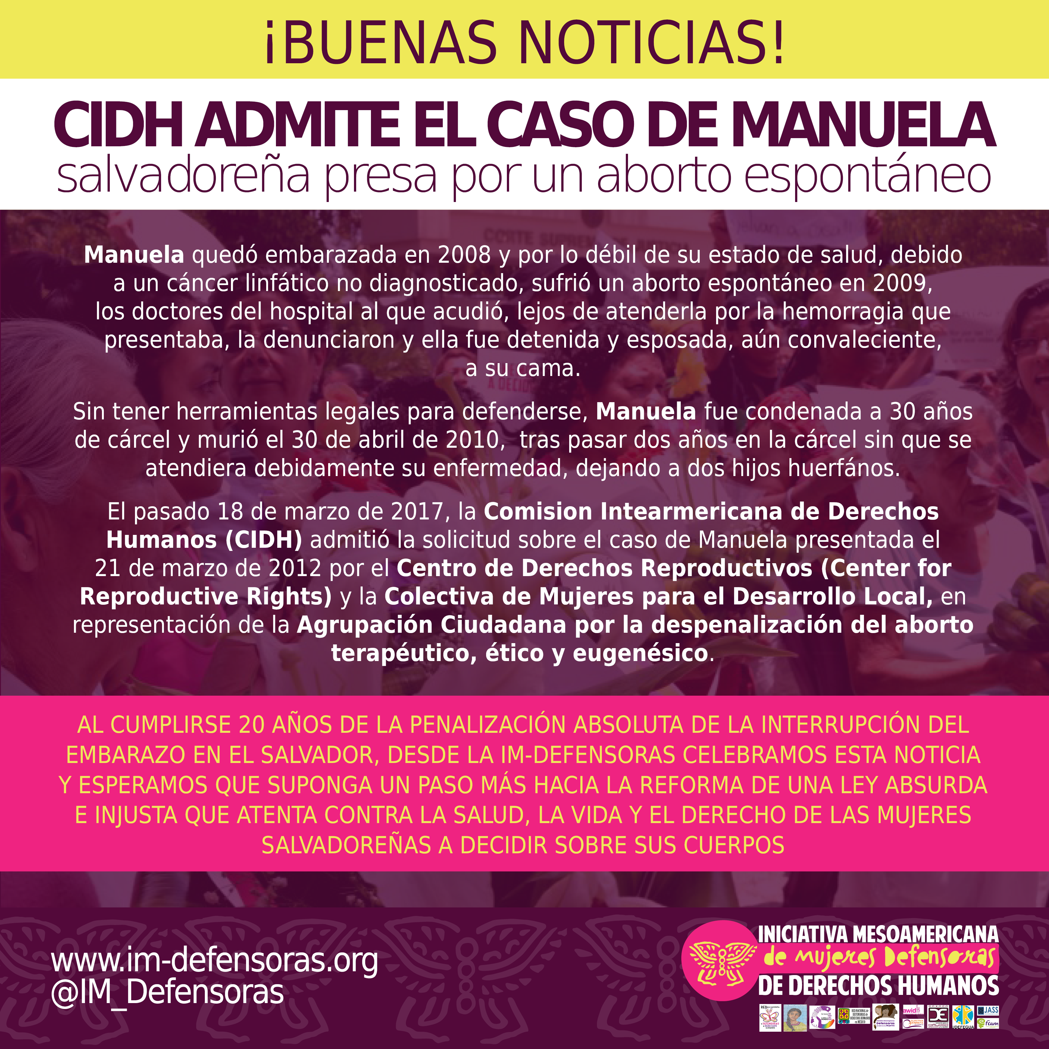 El pasado 18 de marzo de 2017, la Comision Intearmericana de Derechos Humanos (CIDH) admitió la solicitud sobre el caso de Manuela presentada el 21 de marzo de 2012 por el Centro de Derechos Reproductivos (Center for Reproductive Rights) y la Colectiva de Mujeres para el Desarrollo Local, en representación de la Agrupación Ciudadana por la despenalización del aborto terapéutico, ético y eugenésico.