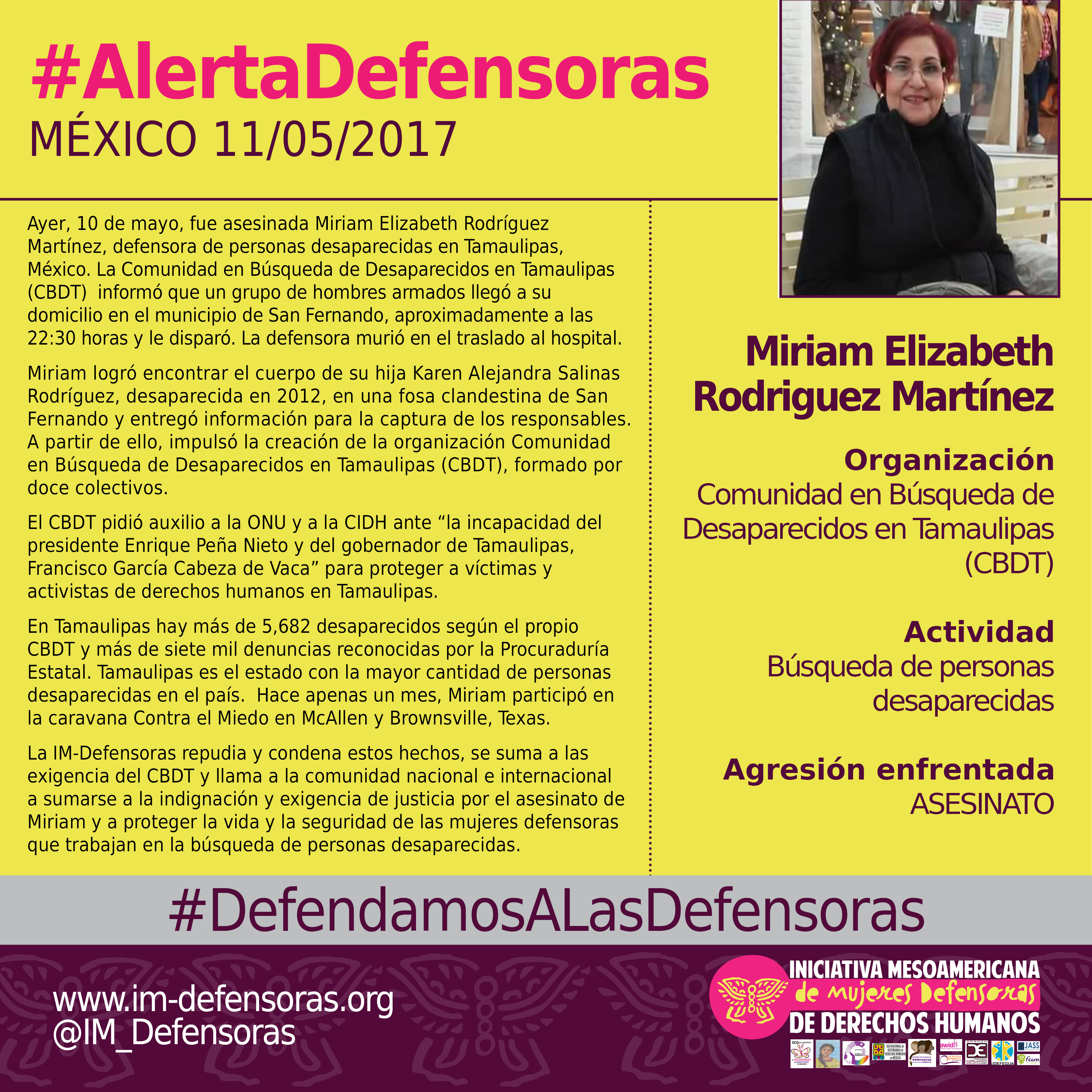 La IM-Defensoras repudia y condena estos hechos, se suma a las exigencia del CBDT y llama a la comunidad nacional e internacional a sumarse a la indignación y exigencia de justicia por el asesinato de Miriam y a proteger la vida y la seguridad de las mujeres defensoras que trabajan en la búsqueda de personas desaparecidas.