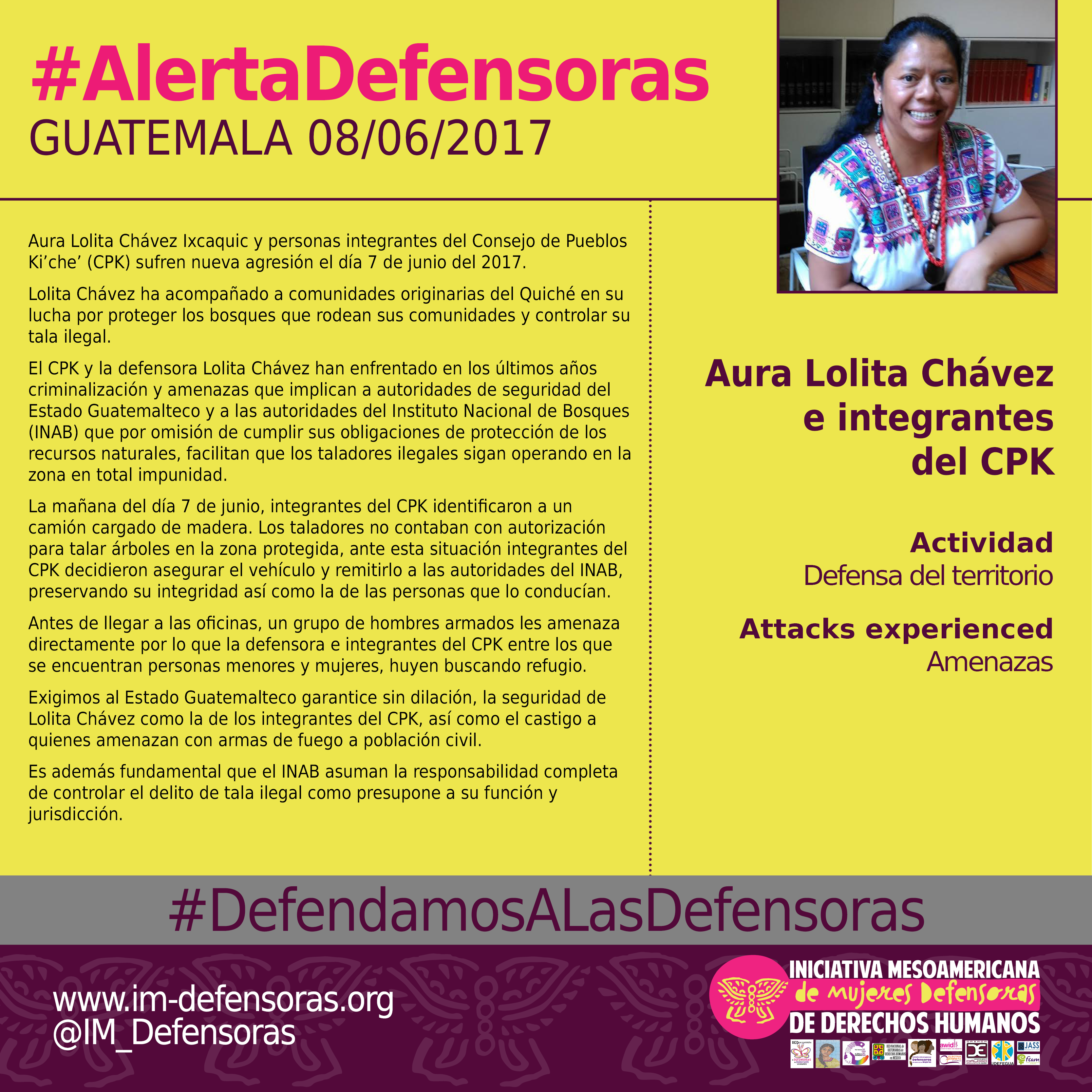 Exigimos al Estado Guatemalteco garantice sin dilación, la seguridad de Lolita Chávez como la de los integrantes del CPK, así como el castigo a quienes amenazan con armas de fuego a población civil.