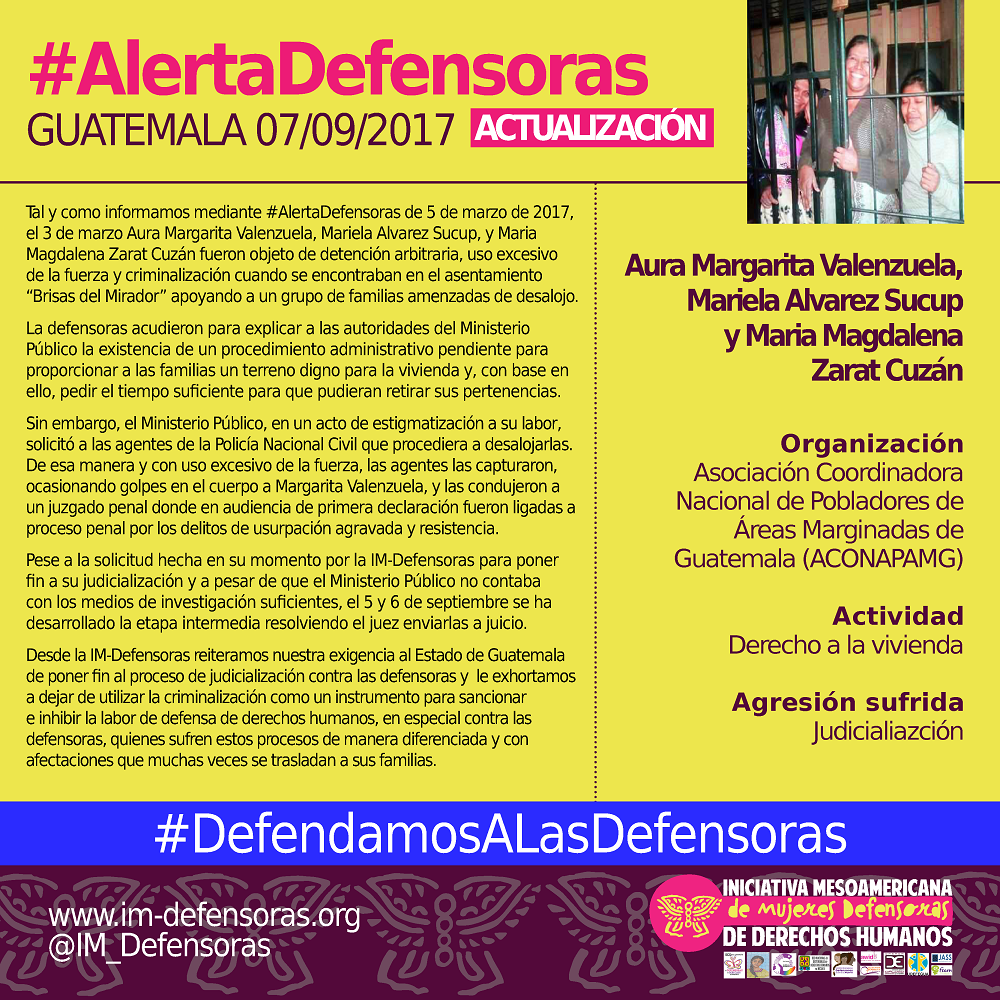 HECHOS - Tal y como informamos mediante #AlertaDefensoras de 5 de marzo de 2017, el 3 de marzo Aura Margarita Valenzuela, Mariela Alvarez Sucup, y Maria Magdalena Zarat Cuzán fueron objeto de detención arbitraria, uso excesivo de la fuerza y criminalización cuando se encontraban en el asentamiento “Brisas del Mirador” apoyando a un grupo de familias amenzadas de desalojo.