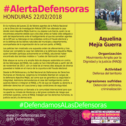 Desde la IM-Defensoras y la Red Nacional de Defensoras de Derechos Humanos en Honduras exigimos la inmediata libertad sin cargos de la defensora Aqeulina Mejía, así como que se garantice su seguridad e integridad. Asimismo demandamos el cese del hostigamiento contra quienes lideran e integran el MADJ, a fin de que se respete su derecho a defender derechos sin coacciones y bajo condiciones de seguridad.