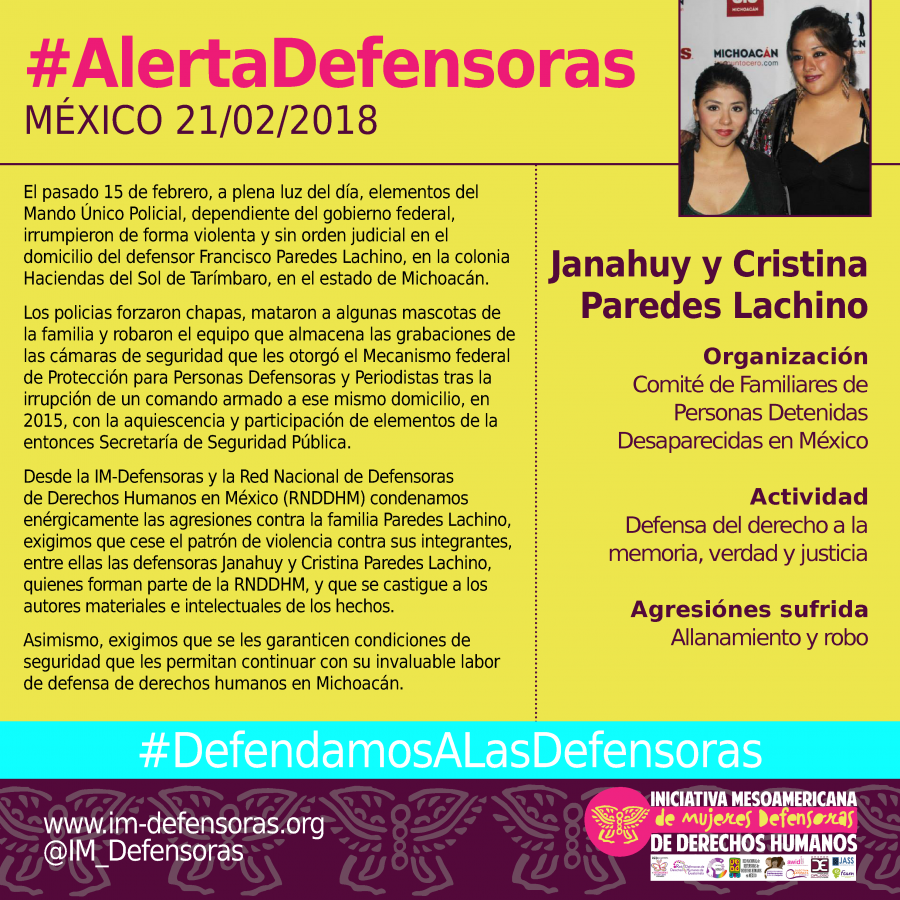 Desde la IM-Defensoras y la Red Nacional de Defensoras de Derechos Humanos en México (RNDDHM) condenamos enérgicamente las agresiones contra la familia Paredes Lachino, exigimos que cese el patrón de violencia contra sus integrantes, entre ellas las defensoras Janahuy y Cristina Paredes Lachino, quienes forman parte de la RNDDHM, y que se castigue a los autores materiales e intelectuales de los hechos.