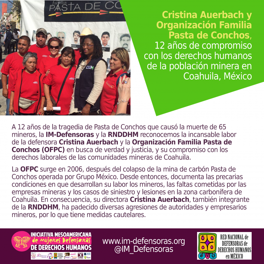 A 12 años de la tragedia de Pasta de Conchos que causó la muerte de 65 mineros, la IM-Defensoras y la RNDDHM reconocemos la incansable labor de la defensora Cristina Auerbach y la Organización Familia Pasta de Conchos (OFPC) en busca de verdad y justicia, y su compromiso con los derechos laborales de las comunidades mineras de Coahuila.