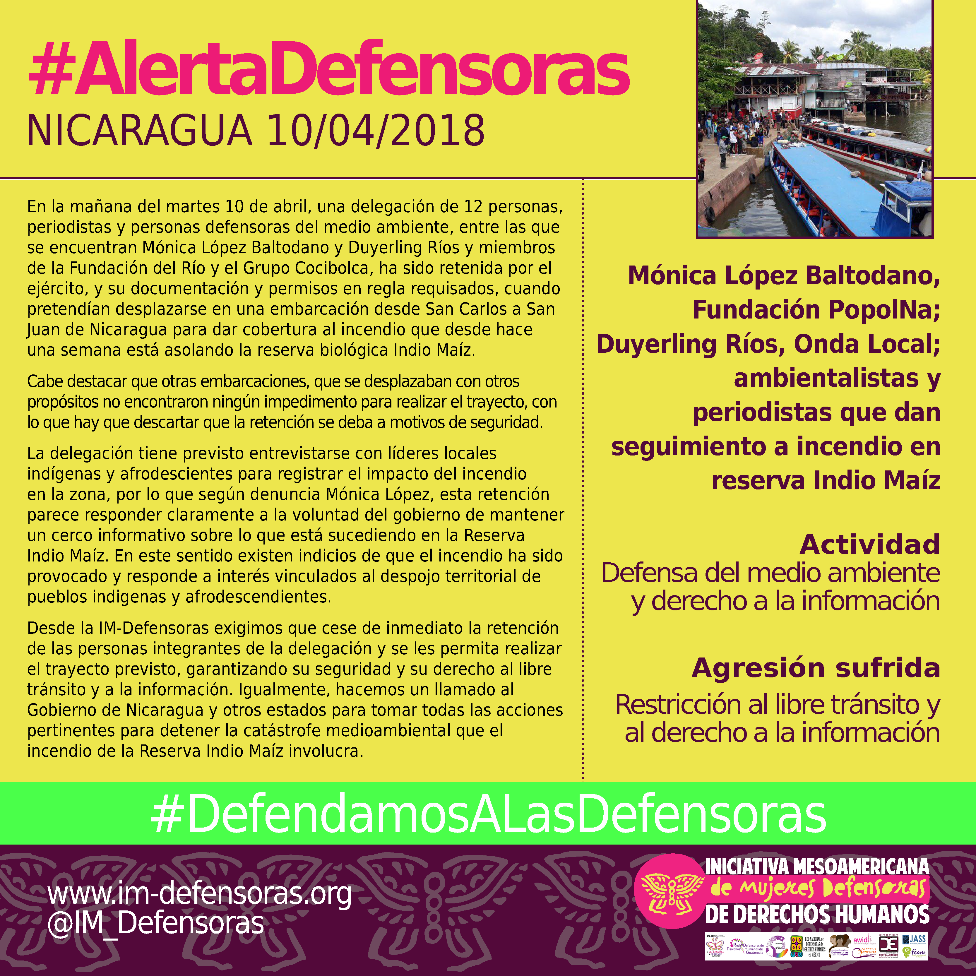 Desde la IM-Defensoras exigimos que cese de inmediato la retención de las personas integrantes de la delegación y se les permita realizar el trayecto previsto, garantizando su seguridad y su derecho al libre tránsito y a la información. Igualmente, hacemos un llamado al Gobierno de Nicaragua y otros estados para tomar todas las acciones pertinentes para detener la catástrofe medioambiental que el incendio de la Reserva Indio Maíz involucra.