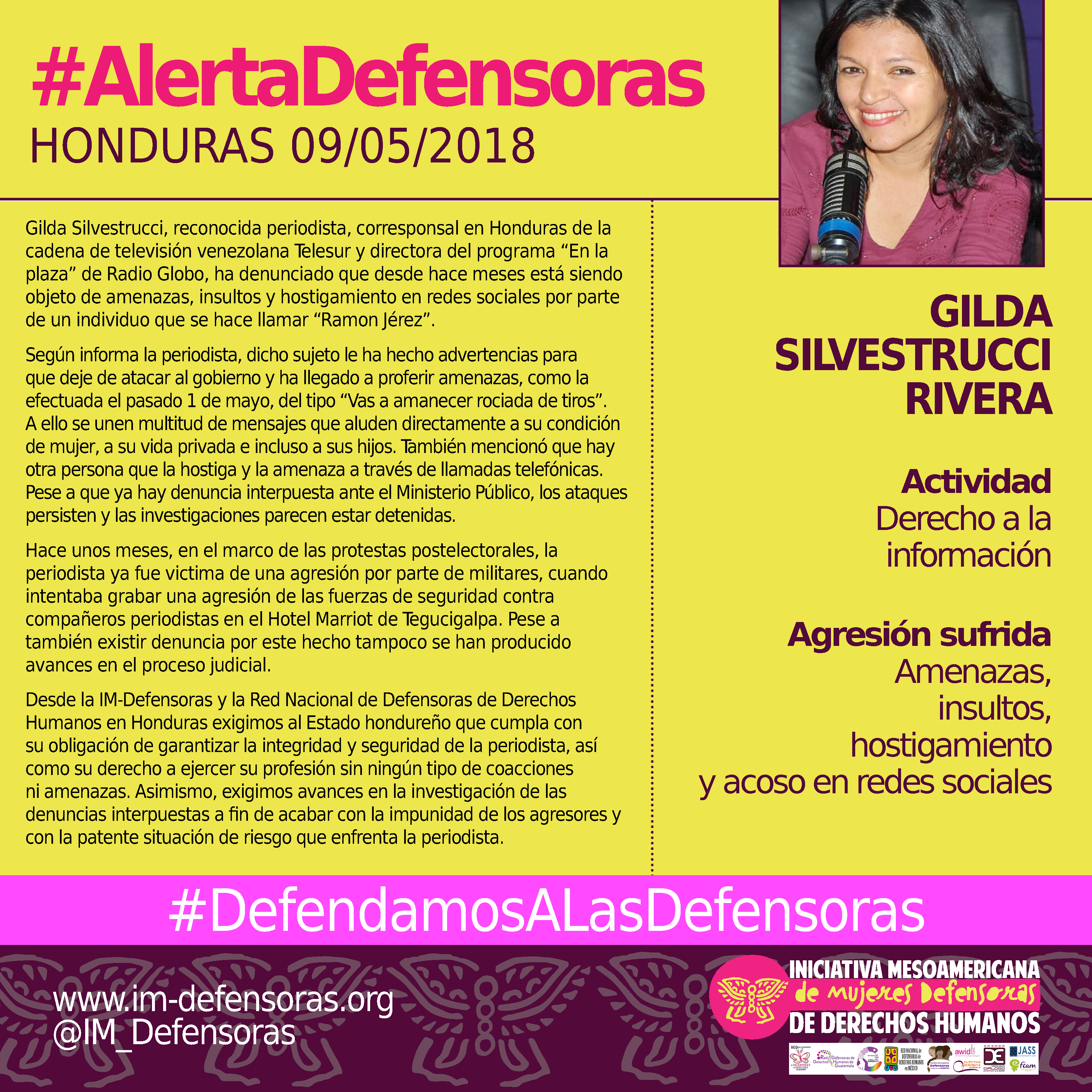 HECHOS - Gilda Silvestrucci, reconocida periodista, corresponsal en Honduras de la cadena de televisión venezolana Telesur y directora del programa “En la plaza” de Radio Globo, ha denunciado que desde hace meses está siendo objeto de amenazas, insultos y hostigamiento en redes sociales por parte de un individuo que se hace llamar “Ramon Jérez”.