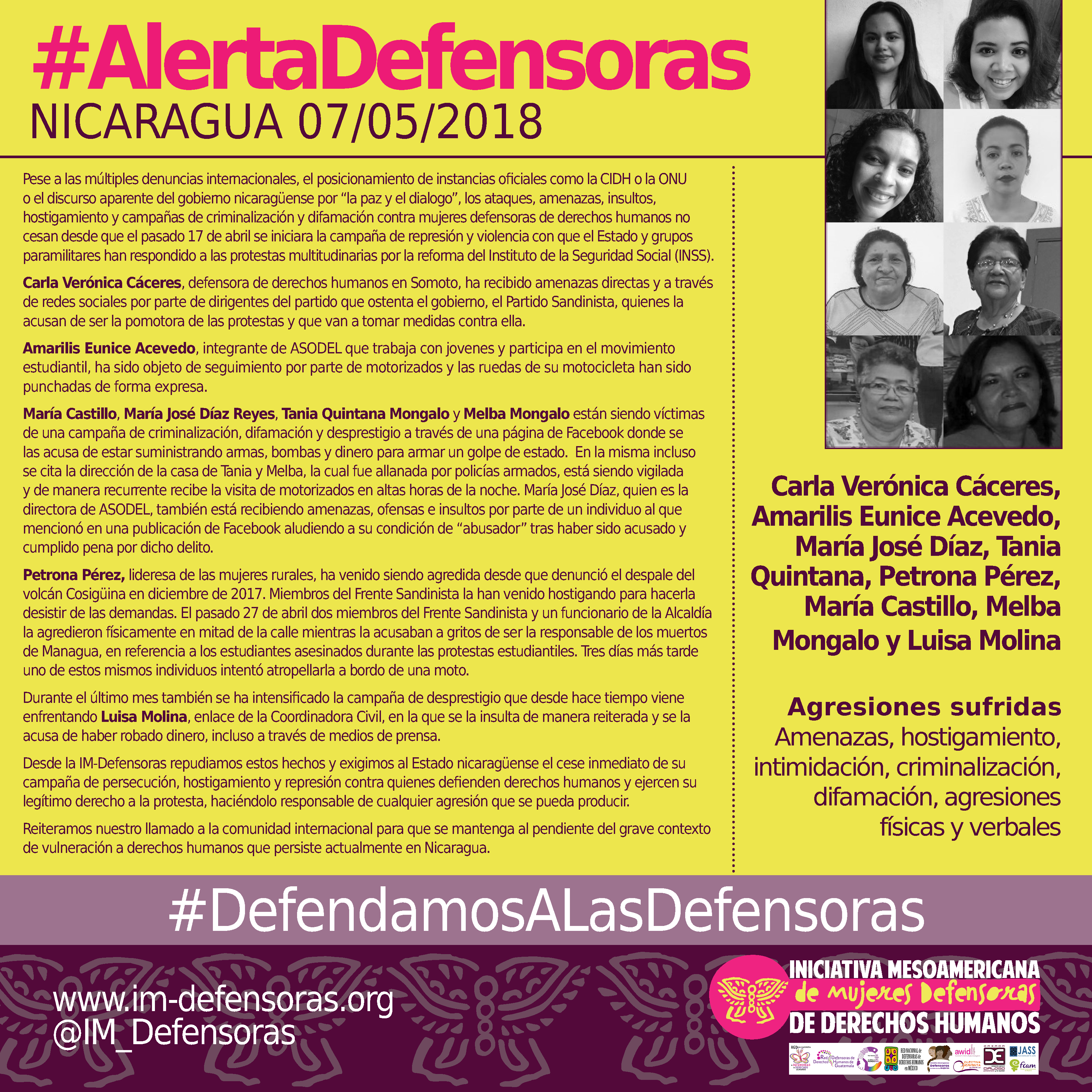 Desde la IM-Defensoras repudiamos estos hechos y exigimos al Estado nicaragüense el cese inmediato de su campaña de persecución, hostigamiento y represión contra quienes defienden derechos humanos y ejercen su legítimo derecho a la protesta, haciéndolo responsable de cualquier agresión que se pueda producir.