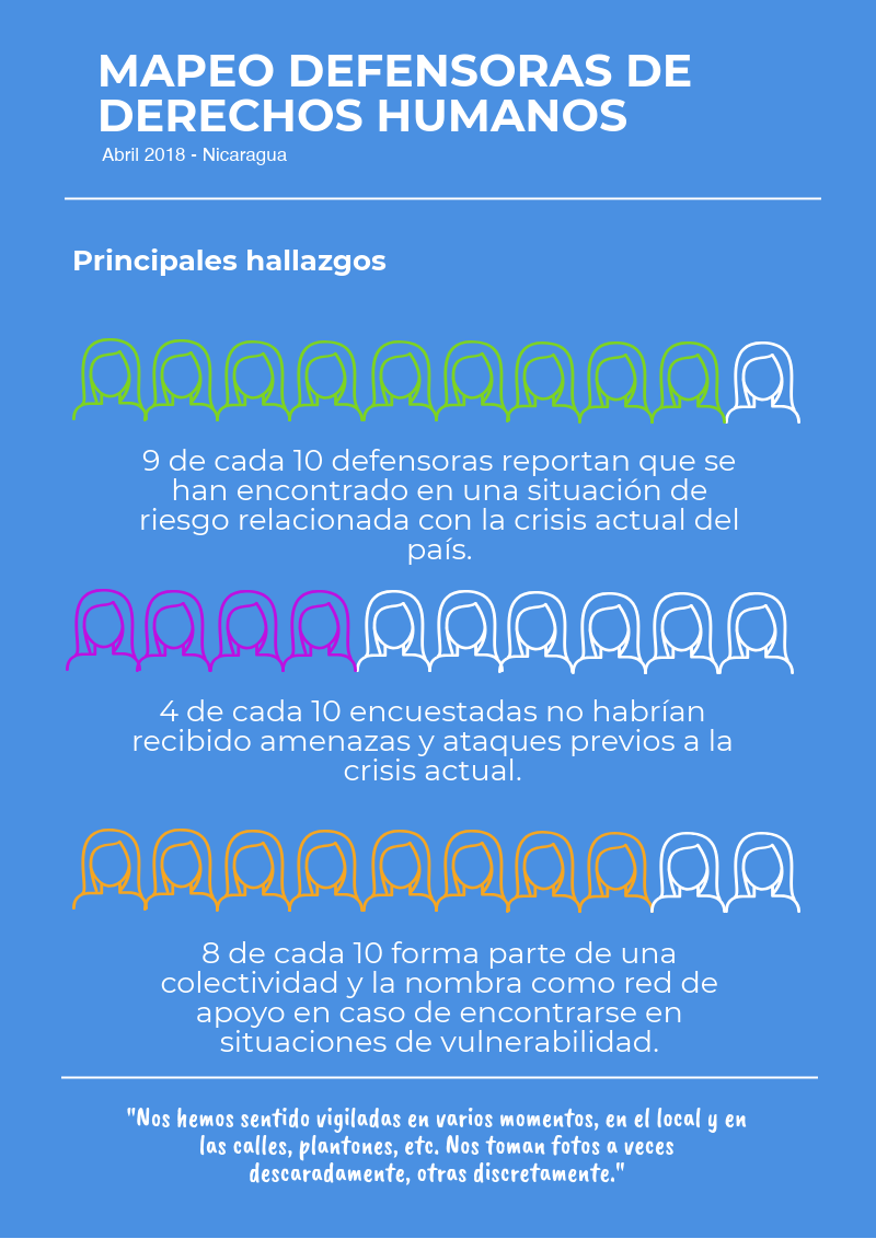 Les compartimos esta secuencia de 6 infografías sobre la situación de las defensoras en Nicaragua. Este mapeo se basa en 112 encuestas a mujeres que se identifican como defensoras, realizadas durante 7 días en una plataforma virtual, compuestas por 38 preguntas y con énfasis en los acontecimientos a partir del 18 de abril.