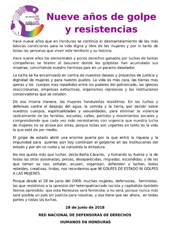 Red Nacional de Defensoras de Derechos Humanos en Honduras - Hace nueve años que en Honduras se continúa el desmantelamiento de las más básicas condiciones para la vida digna y libre de las mujeres y por lo tanto de todas las personas que viven este territorio y su historia.