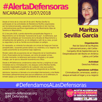 Desde la IM-Defensoras condenamos estos hechos y exigimos el cese inmediato de la criminalización y los ataques contra Maritza Sevilla, haciendo responsable al gobierno de cualquier cosa que pudiera sucederle a ella o a cualquier otra persona integrante de su familia.