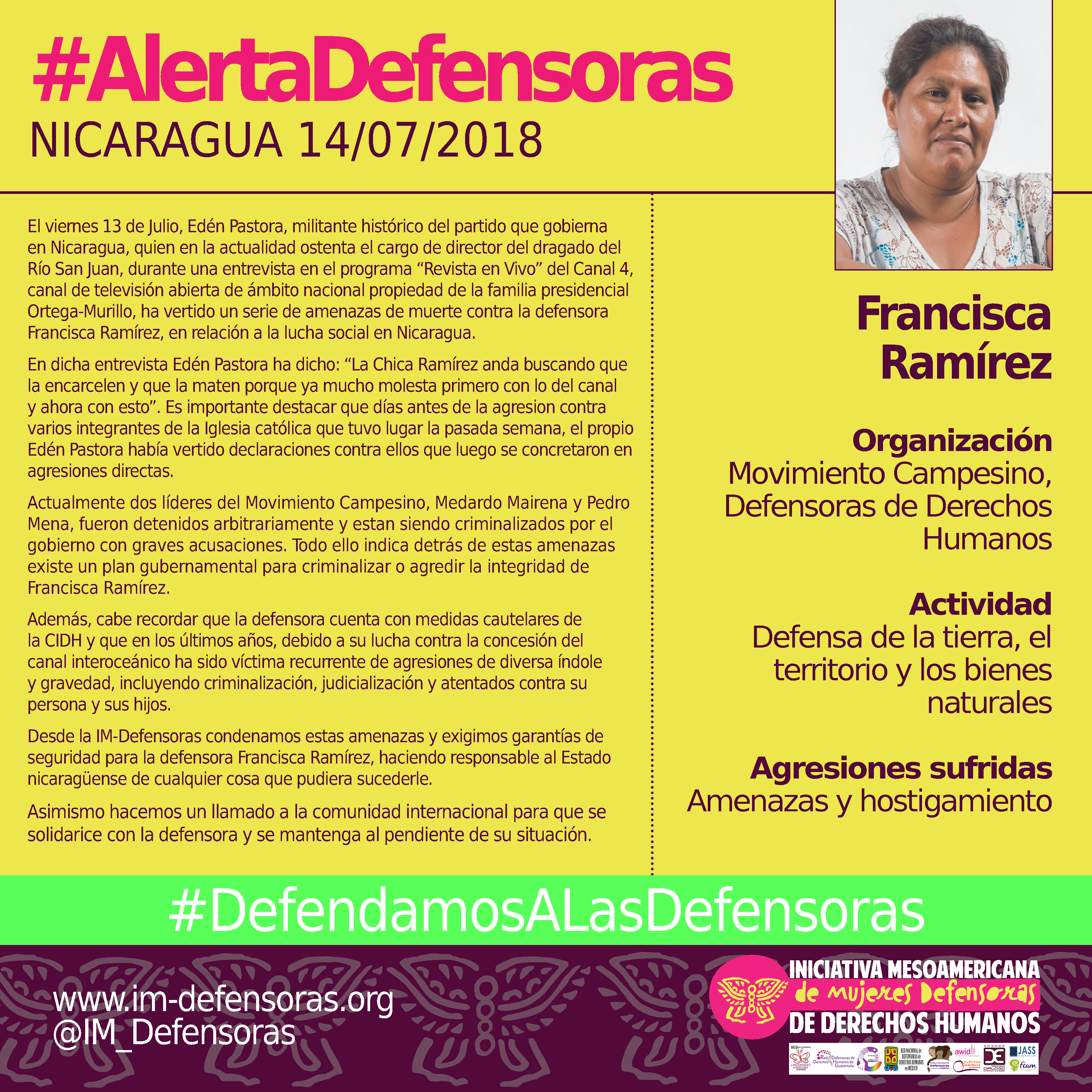 Desde la IM-Defensoras condenamos estas amenazas y exigimos garantías de seguridad para la defensora Francisca Ramírez, haciendo responsable al Estado nicaragüense de cualquier cosa que pudiera sucederle.