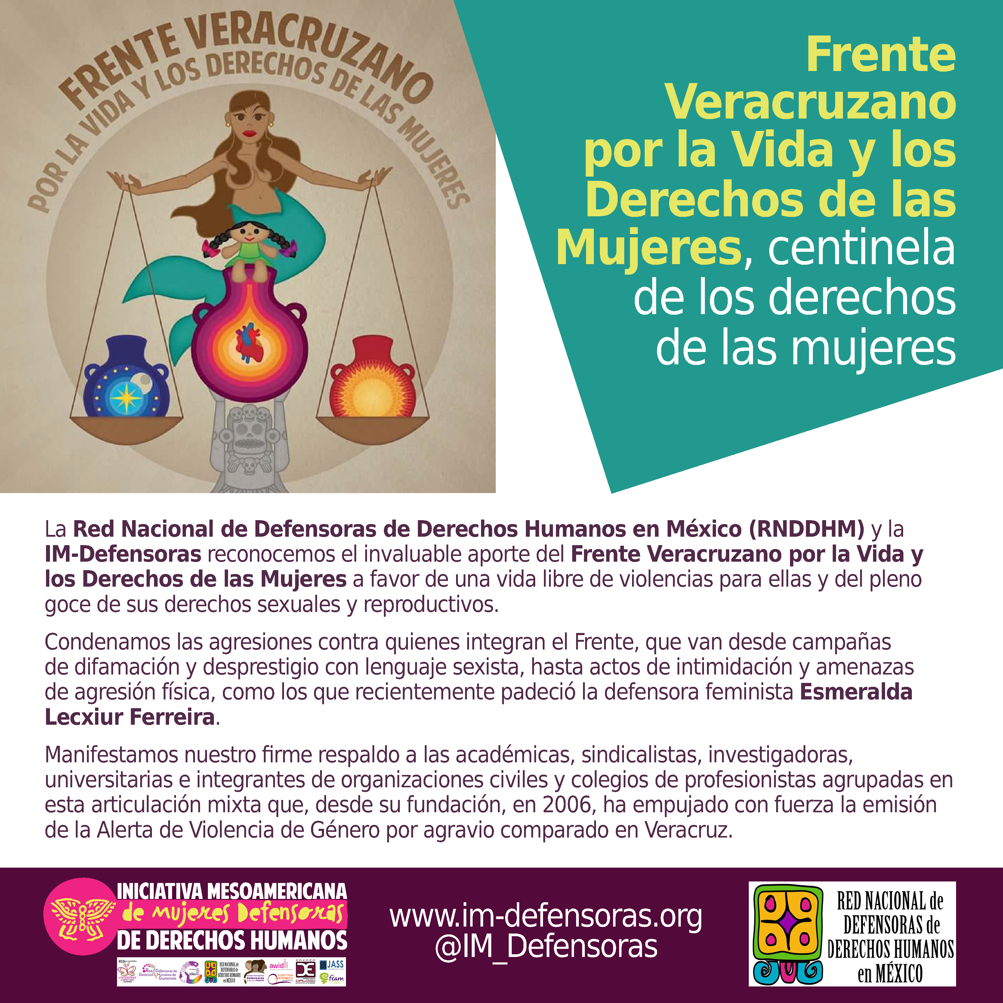 La Red Nacional de Defensoras de Derechos Humanos en México (RNDDHM) y la IM-Defensoras reconocemos el invaluable aporte del Frente Veracruzano por la Vida y los Derechos de las Mujeres a favor de una vida libre de violencias para ellas y del pleno goce de sus derechos sexuales y reproductivos.