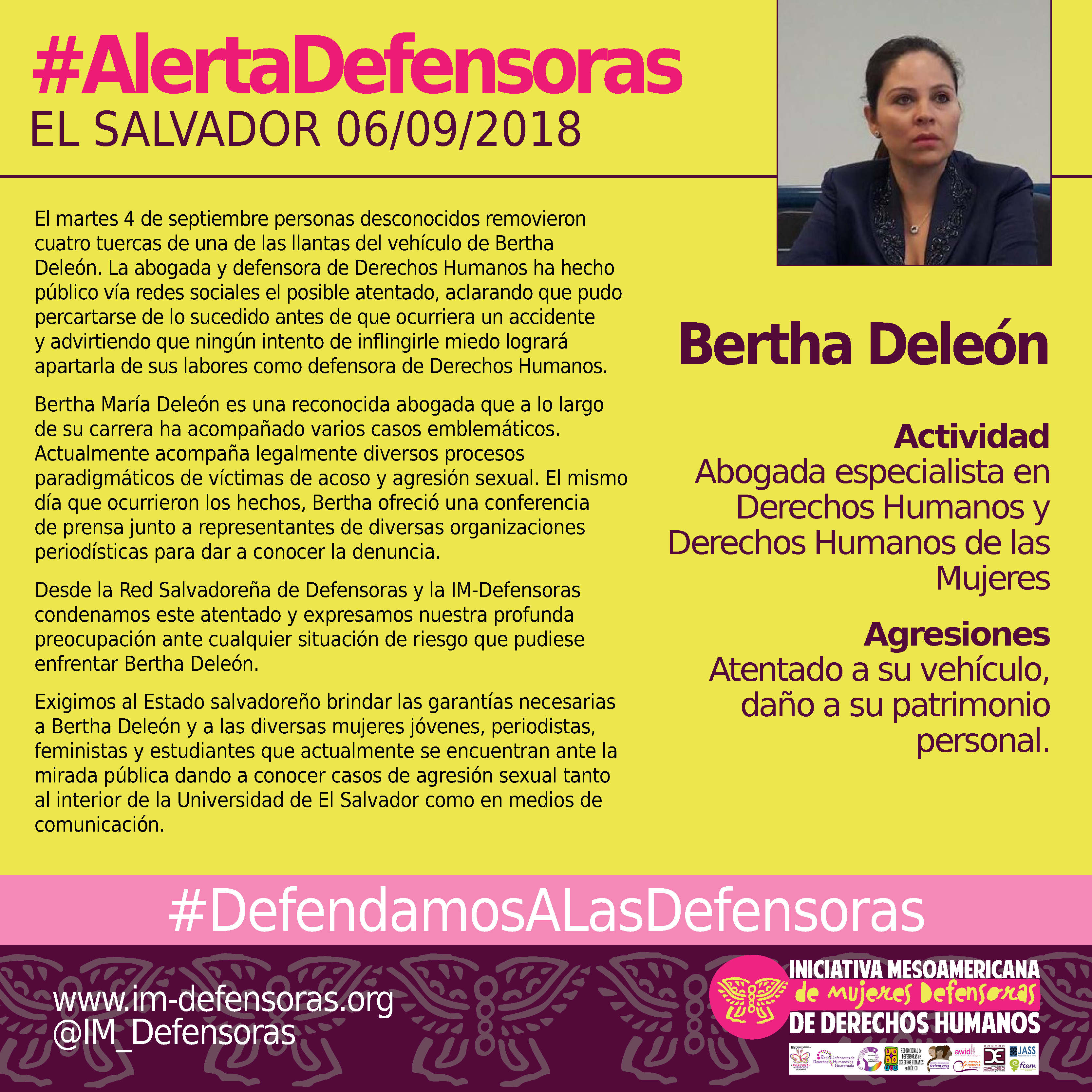 Desde la Red Salvadoreña de Defensoras y la IM-Defensoras condenamos este atentado y expresamos nuestra profunda preocupación ante cualquier situación de riesgo que pudiese enfrentar Bertha Deleón.