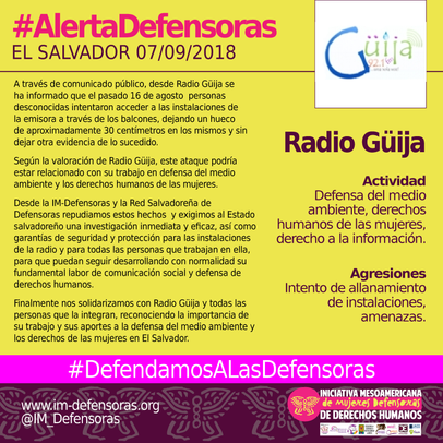 Finalmente nos solidarizamos con Radio Güija y todas las personas que la integran, reconociendo la importancia de su trabajo y sus aportes a la defensa del medio ambiente y los derechos de las mujeres en El Salvador.