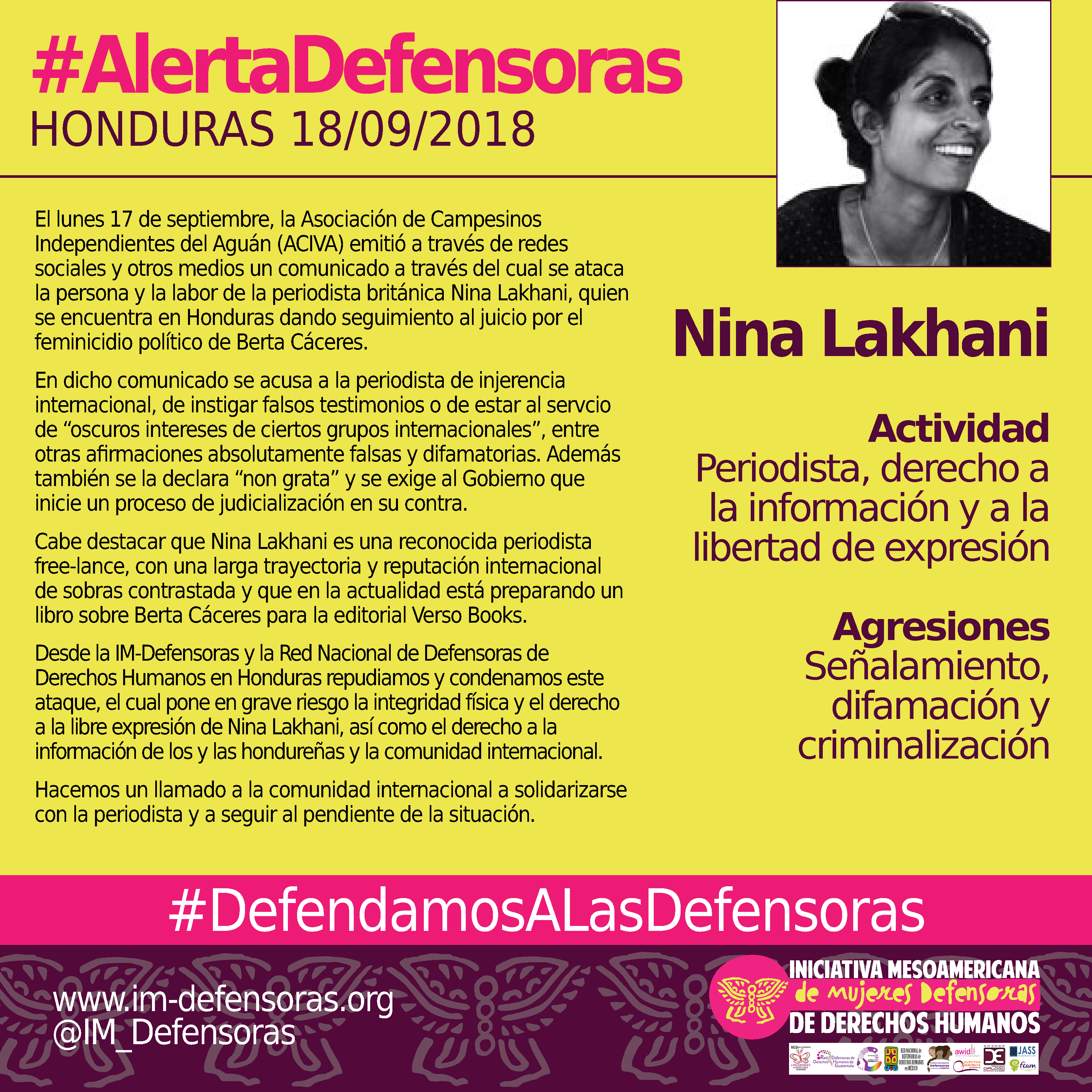 Desde la IM-Defensoras y la Red Nacional de Defensoras de Derechos Humanos en Honduras repudiamos y condenamos este ataque, el cual pone en grave riesgo la integridad física y el derecho a la libre expresión de Nina Lakhani, así como el derecho a la información de los y las hondureñas y la comunidad internacional.