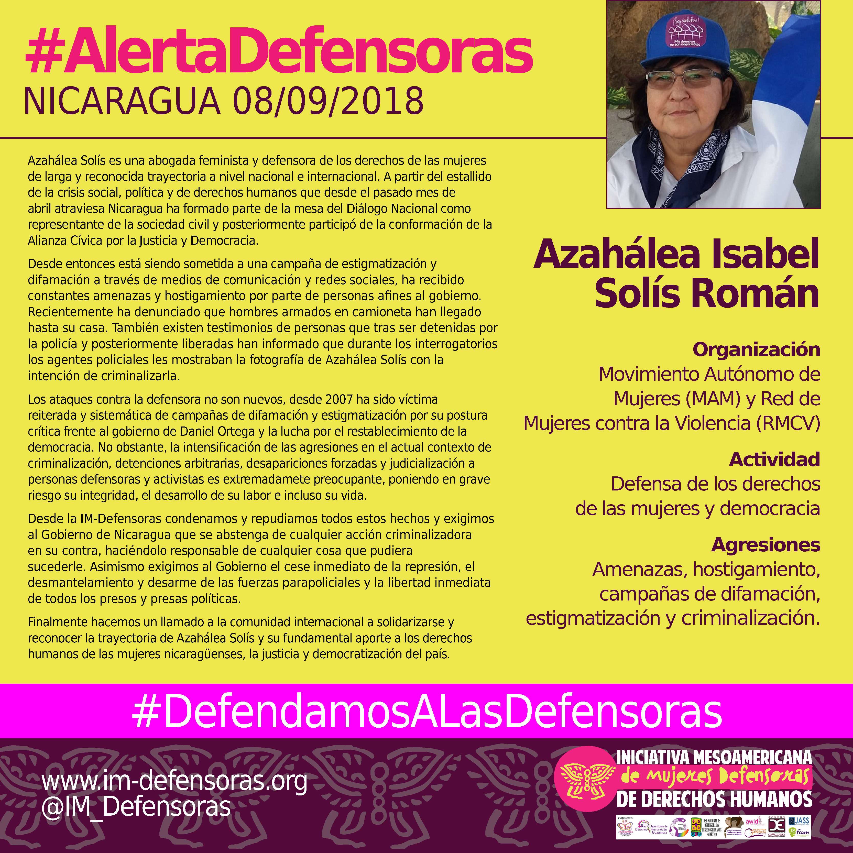 HECHOS - Azahálea Solís es una abogada feminista y defensora de los derechos de las mujeres de larga y reconocida trayectoria a nivel nacional e internacional. A partir del estallido de la crisis social, política y de derechos humanos que desde el pasado mes de abril atraviesa Nicaragua ha formado parte de la mesa del Diálogo Nacional como representante de la sociedad civil y posteriormente participó de la conformación de la Alianza Cívica por la Justicia y Democracia.