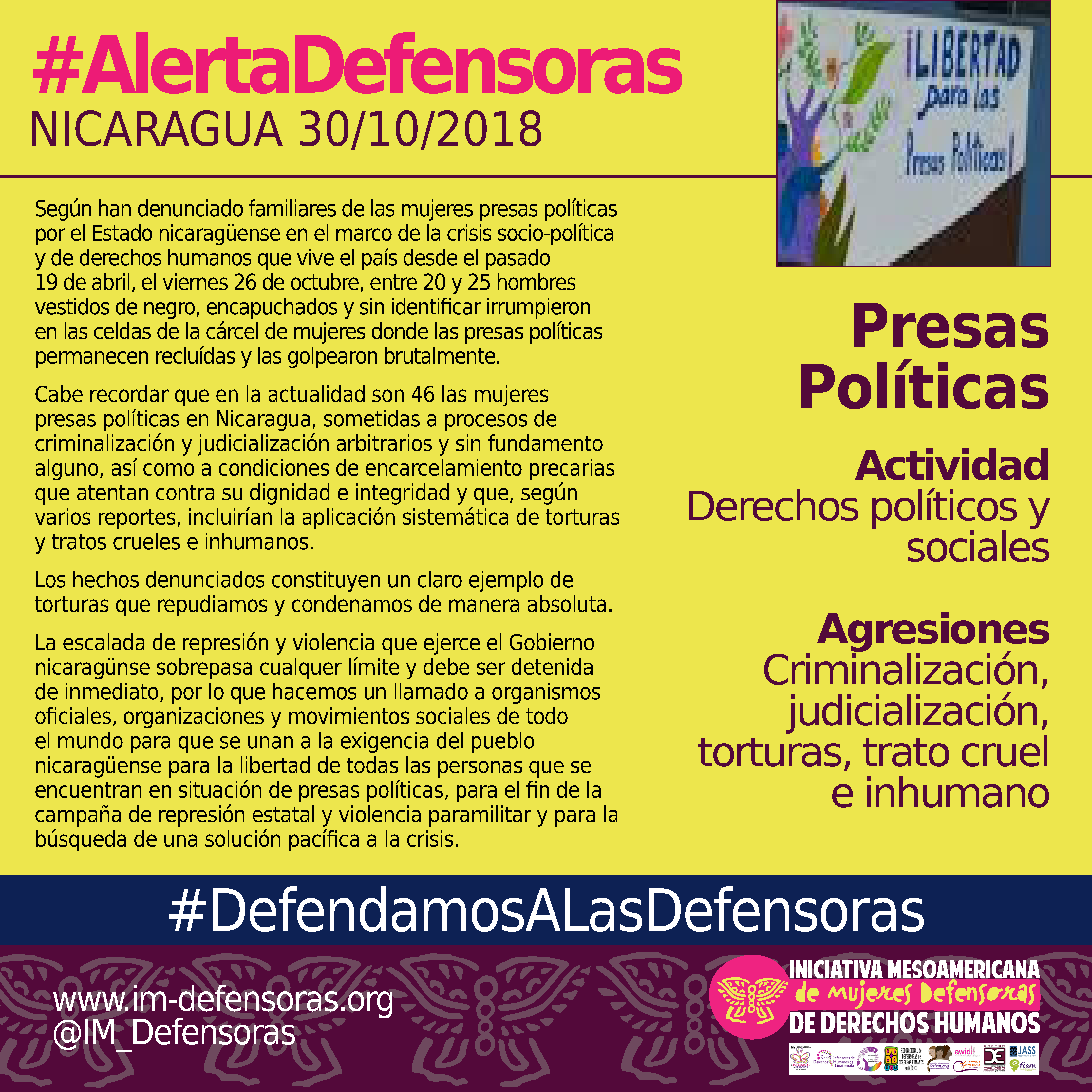 Cabe recordar que en la actualidad son 46 las mujeres presas políticas en Nicaragua, sometidas a procesos de criminalización y judicialización arbitrarios y sin fundamento alguno, así como a condiciones de encarcelamiento precarias que atentan contra su dignidad e integridad y que, según varios reportes, incluirían la aplicación sistemática de torturas y tratos crueles e inhumanos.