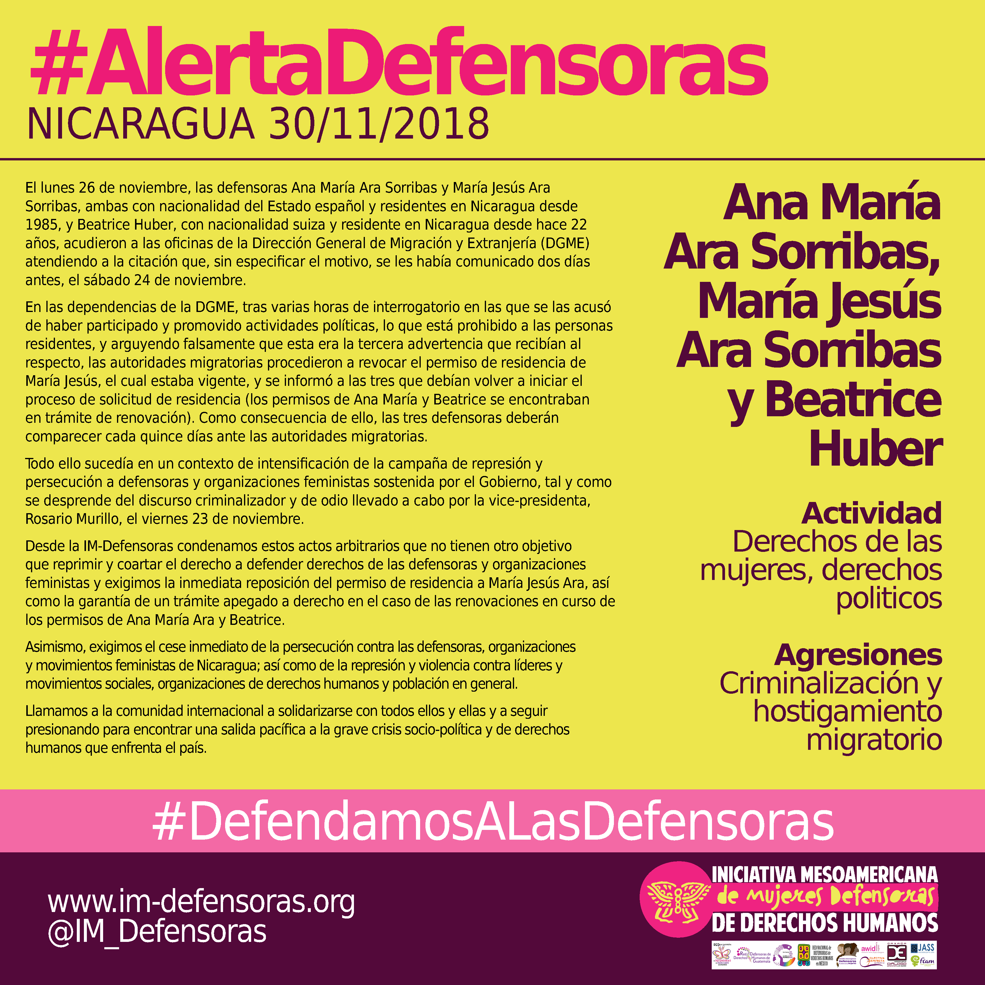 HECHOS - El lunes 26 de noviembre, las defensoras Ana María Ara Sorribas y María Jesús Ara Sorribas, ambas con nacionalidad del Estado español y residentes en Nicaragua desde 1985, y Beatrice Huber, con nacionalidad suiza y residente en Nicaragua desde hace 22 años, acudieron a las oficinas de la Dirección General de Migración y Extranjería (DGME) atendiendo a la citación que, sin especificar el motivo, se les había comunicado dos días antes, el sábado 24 de noviembre.