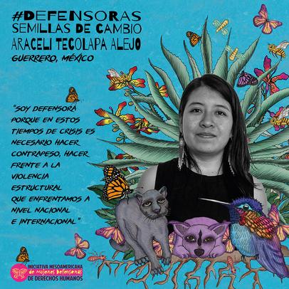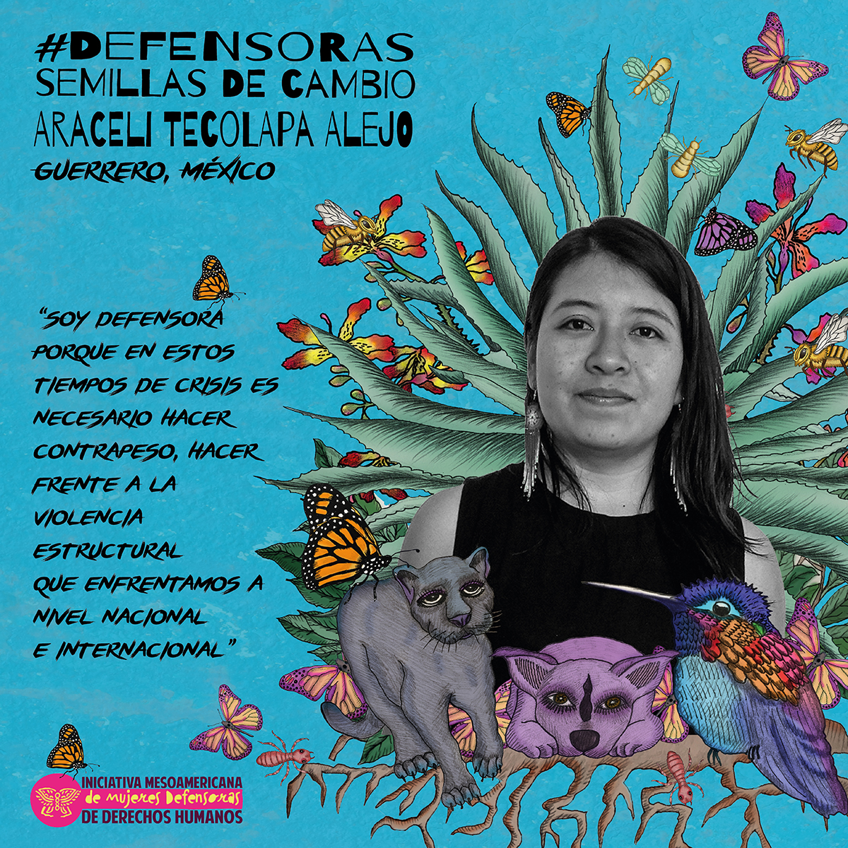 Araceli Tecolapa es una joven comunicadora indígena que desde hace 5 años trabaja en la defensa de los derechos de las poblaciones indígenas, los derechos de las mujeres y por una vida libre de violencia en el Estado de Guerrero, México. Parte fundamental del trabajo de Araceli consiste en acompañar a mujeres indígenas en contextos de violencia desde un enfoque psicosocial que facilite su empoderamiento. También es muy activa en el combate a la discriminación y la violencia institucional contra las mujeres, especialmente jóvenes, al interior de organizaciones y movimientos.