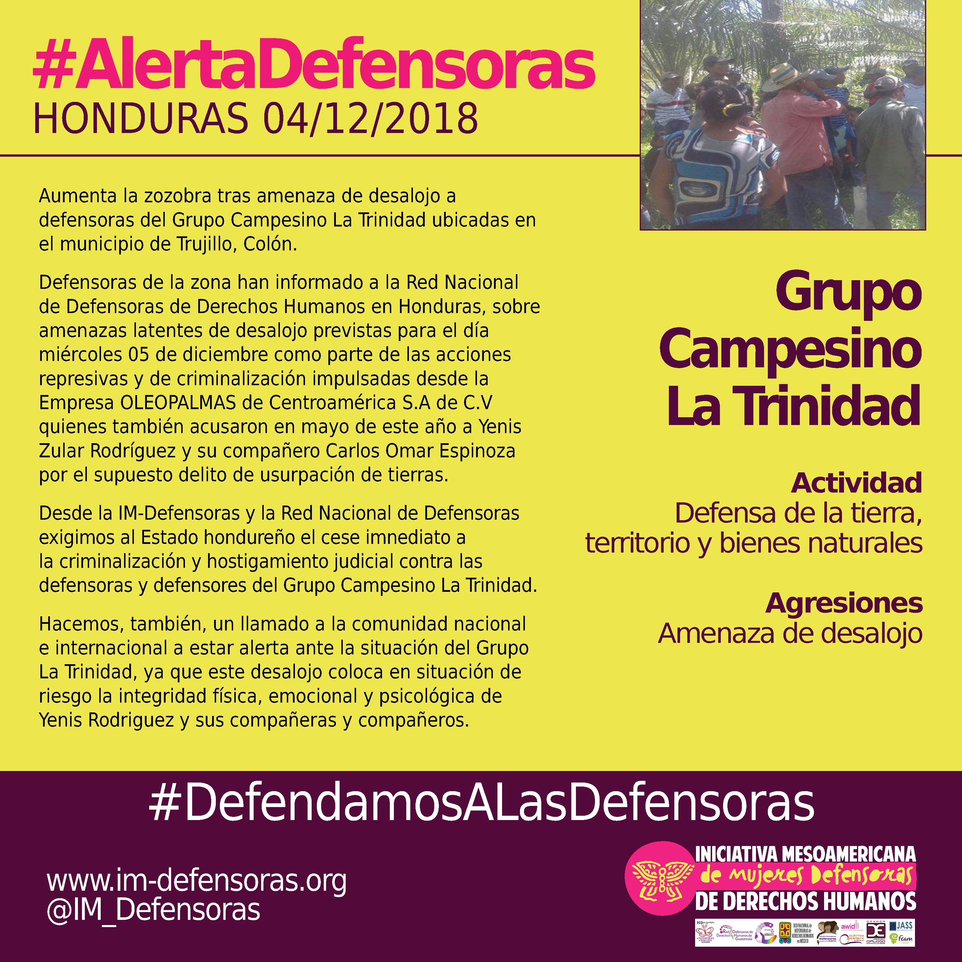 Desde la IM-Defensoras y la Red Nacional de Defensoras exigimos al Estado hondureño el cese imnediato a la criminalización y hostigamiento judicial contra las defensoras y defensores del Grupo Campesino La Trinidad.