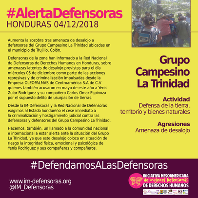 Defensoras de la zona han informado a la Red Nacional de Defensoras de Derechos Humanos en Honduras, sobre amenazas latentes de desalojo previstas para el día miércoles 05 de diciembre como parte de las acciones represivas y de criminalización impulsadas desde la Empresa OLEOPALMAS de Centroamérica S.A de C.V quienes también acusaron en mayo de este año a Yenis Zular Rodríguez y su compañero Carlos Omar Espinoza por el supuesto delito de usurpación de tierras.