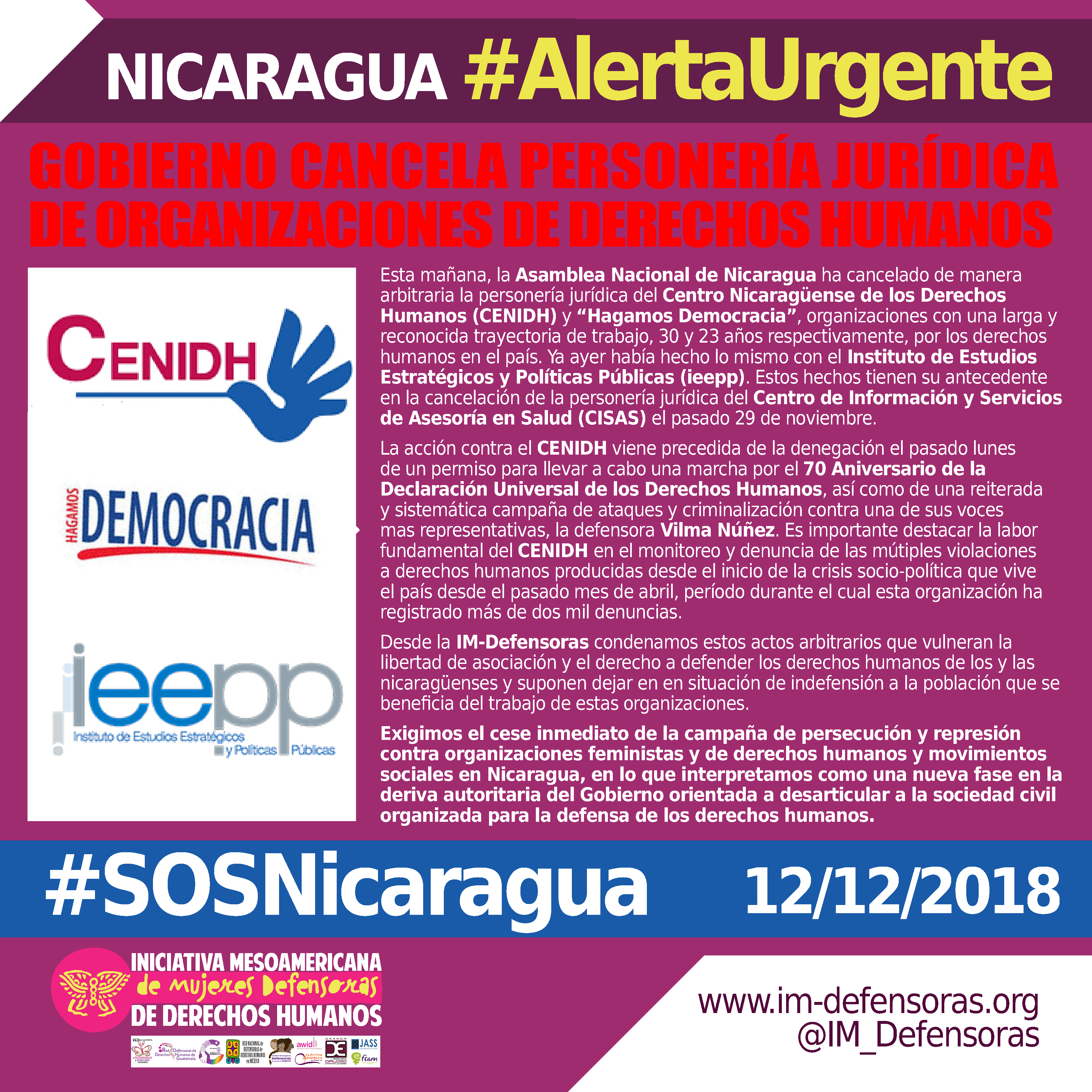 Esta mañana, la Asamblea Nacional de Nicaragua ha cancelado de manera arbitraria la personería jurídica del Centro Nicaragüense de los Derechos Humanos (CENIDH) y “Hagamos Democracia”, organizaciones con una larga y reconocida trayectoria de trabajo, 30 y 23 años respectivamente, por los derechos humanos en el país. Ya ayer había hecho lo mismo con el Instituto de Estudios Estratégicos y Políticas Públicas (ieepp). Estos hechos tienen su antecedente en la cancelación de la personería jurídica del Centro de Información y Servicios de Asesoría en Salud (CISAS) el pasado 29 de noviembre.