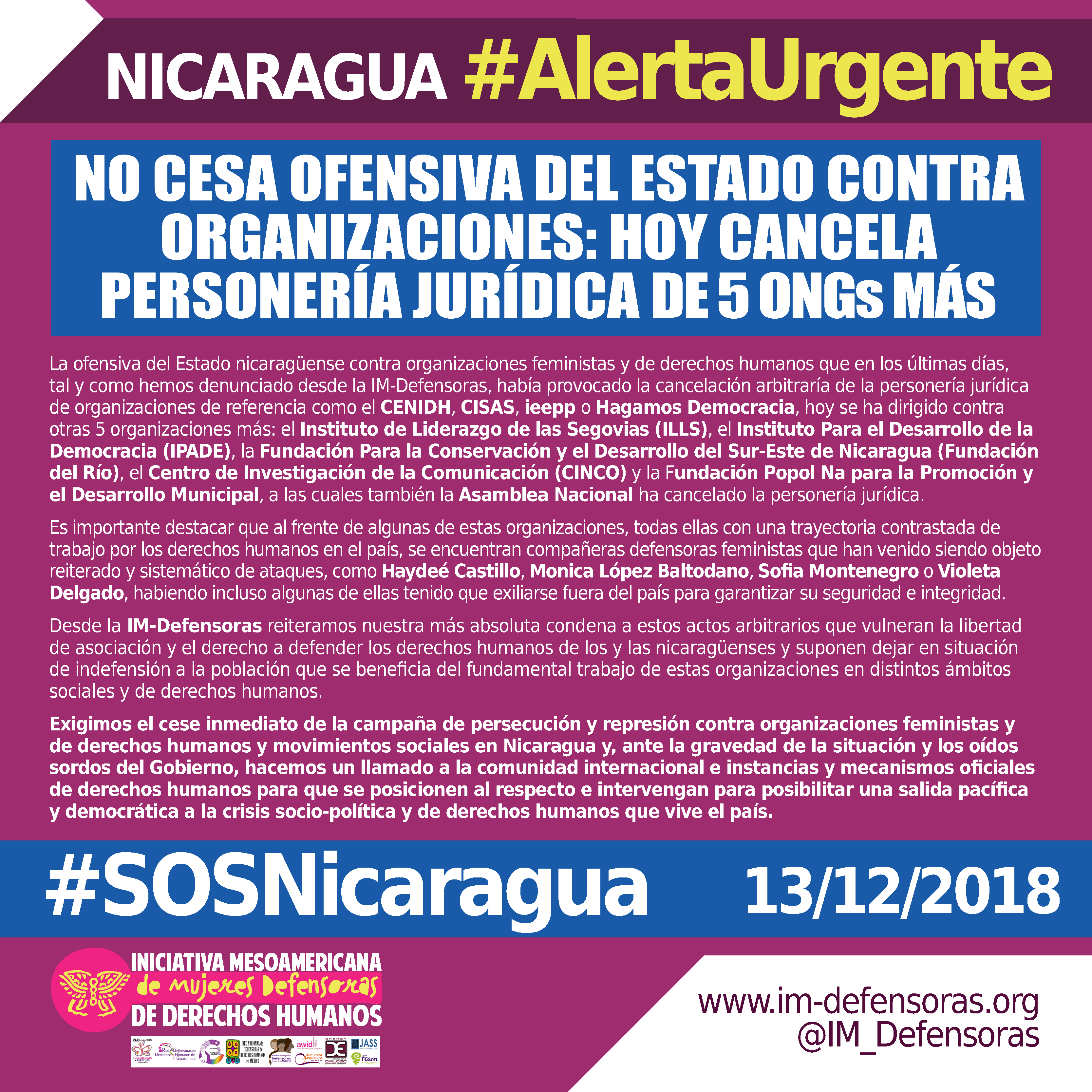 Desde la IM-Defensoras reiteramos nuestra más absoluta condena a estos actos arbitrarios que vulneran la libertad de asociación y el derecho a defender los derechos humanos de los y las nicaragüenses y suponen dejar en situación de indefensión a la población que se beneficia del fundamental trabajo de estas organizaciones en distintos ámbitos sociales y de derechos humanos.