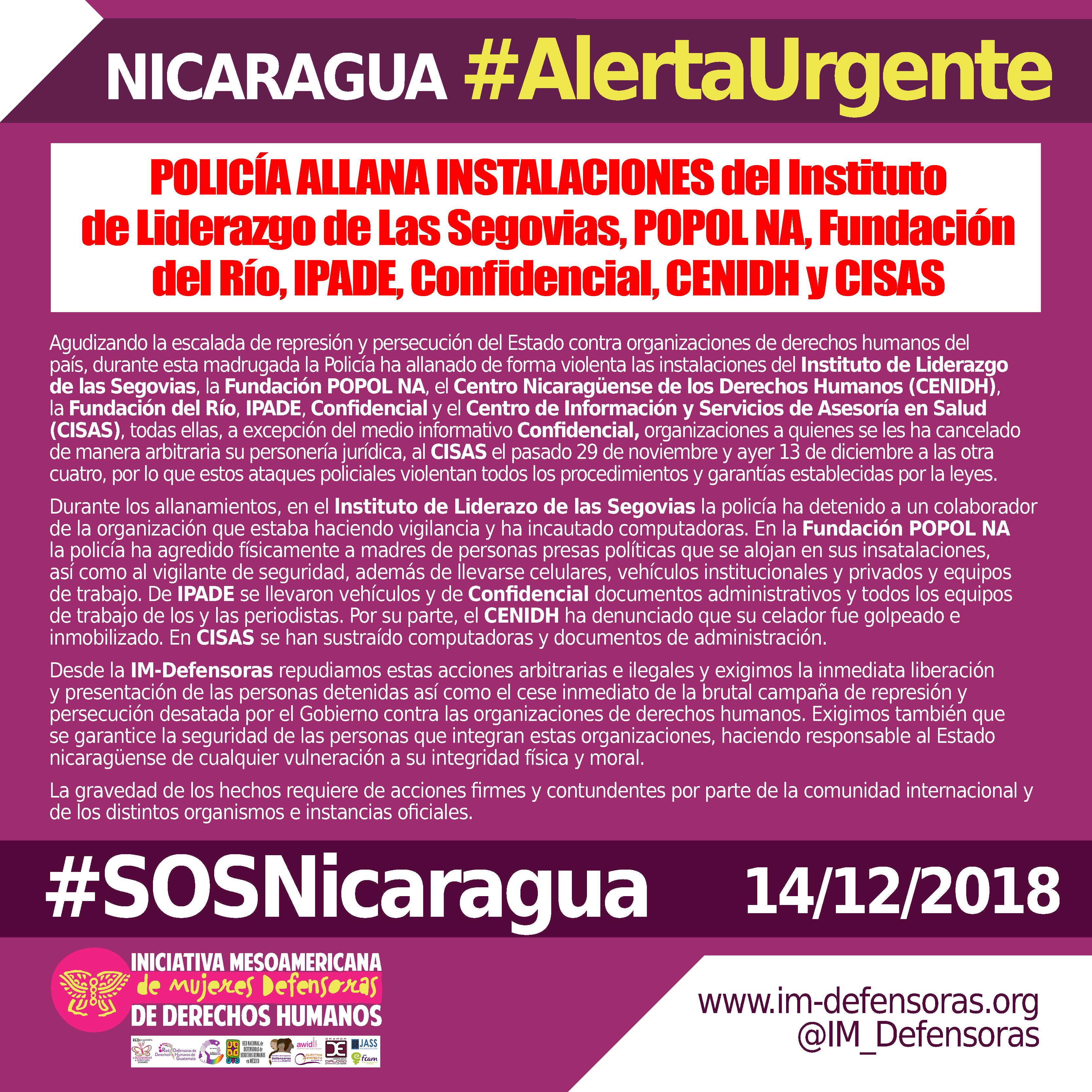 Agudizando la escalada de represión y persecución del Estado contra organizaciones de derechos humanos del país, durante esta madrugada la Policía ha allanado de forma violenta las instalaciones del Instituto de Liderazgo de las Segovias, la Fundación POPOL NA, el Centro Nicaragüense de los Derechos Humanos (CENIDH), la Fundación del Río, IPADE, Confidencial y el Centro de Información y Servicios de Asesoría en Salud (CISAS), todas ellas, a excepción del medio informativo Confidencial, organizaciones a quienes se les ha cancelado de manera arbitraria su personería jurídica, al CISAS el pasado 29 de noviembre y ayer 13 de diciembre a las otra cuatro, por lo que estos ataques policiales violentan todos los procedimientos y garantías establecidas por la leyes.
