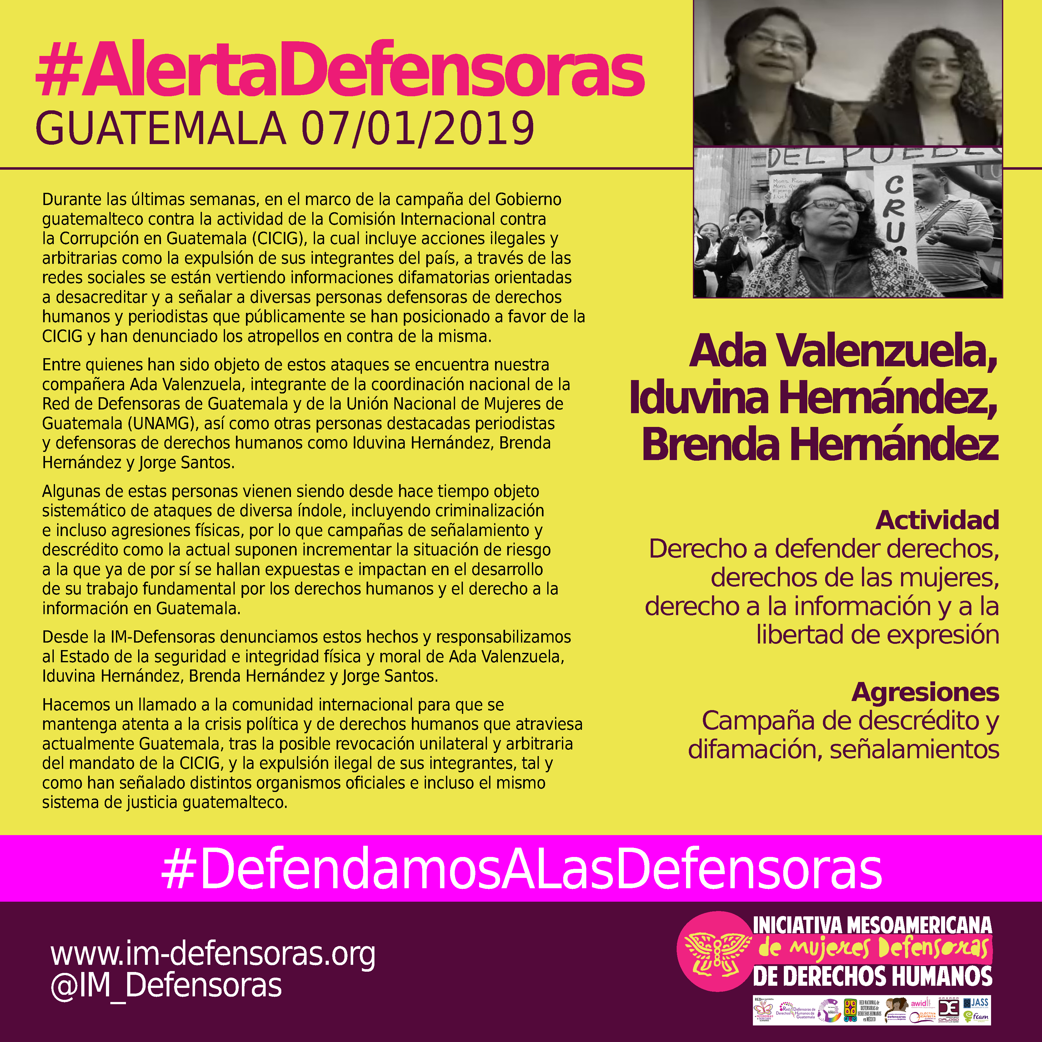 Entre quienes han sido objeto de estos ataques se encuentra nuestra compañera Ada Valenzuela, integrante de la coordinación nacional de la Red de Defensoras de Guatemala y de la Unión Nacional de Mujeres de Guatemala (UNAMG), así como otras personas destacadas periodistas y defensoras de derechos humanos como Iduvina Hernández, Brenda Hernández y Jorge Santos.