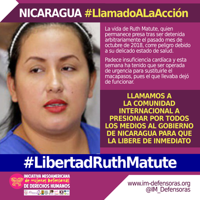 La vida de Ruth Matute, quien permanece presa tras ser detenida arbitrariamente el pasado mes de octubre de 2018, corre peligro debido a su delicado estado de salud.