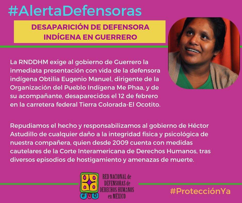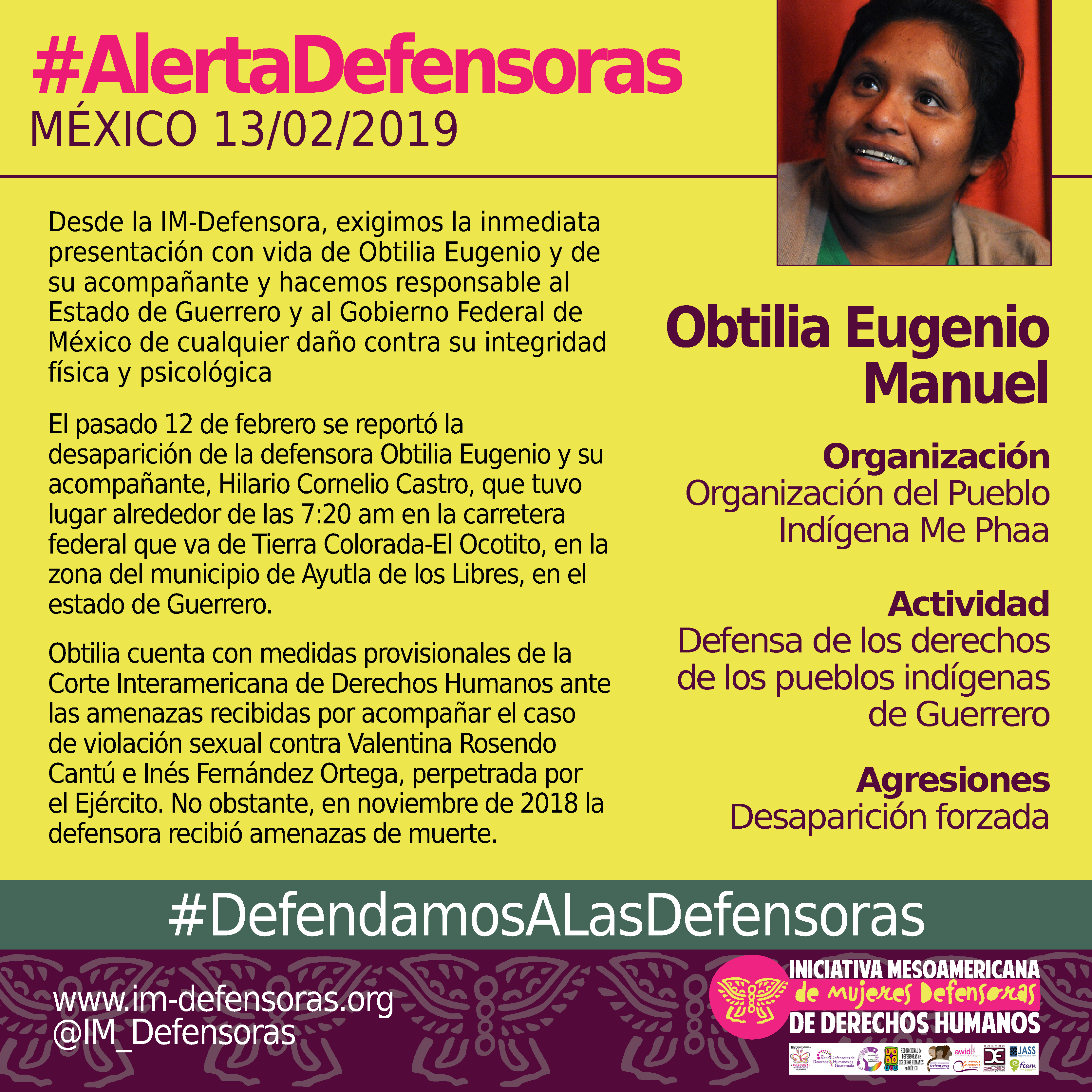 HECHOS - Desde la IM-Defensora, exigimos la inmediata presentación con vida de Obtilia Eugenio y de su acompañante y hacemos responsable al Estado de Guerrero y al Gobierno Federal de México de cualquier daño contra su integridad física y psicológica.