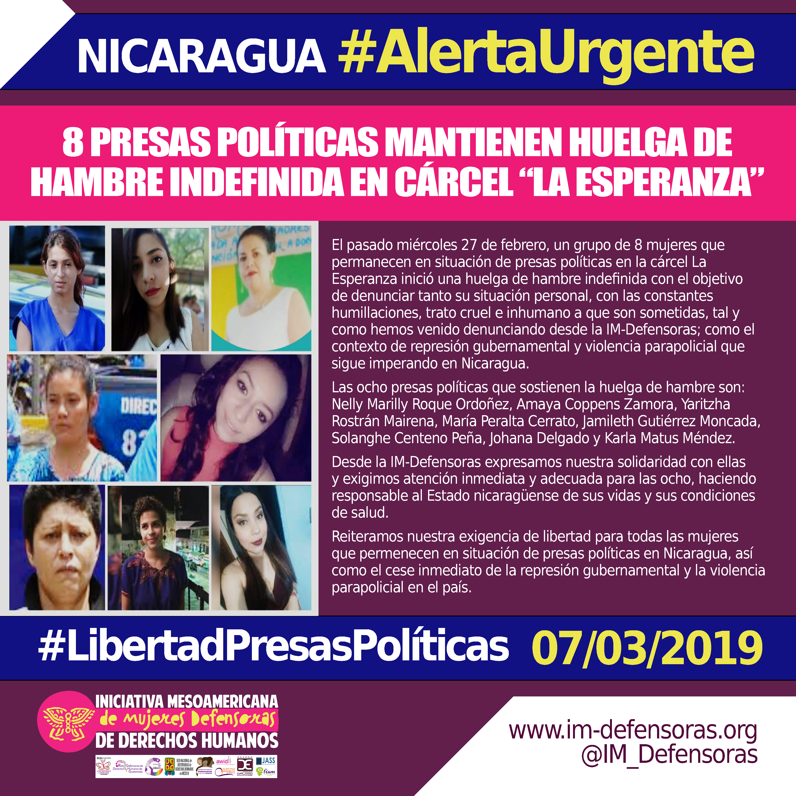 El pasado miércoles 27 de febrero, un grupo de 8 mujeres que permanecen en situación de presas políticas en la cárcel La Esperanza inició una huelga de hambre indefinida con el objetivo de denunciar tanto su situación personal, con las constantes humillaciones, trato cruel e inhumano a que son sometidas, tal y como hemos venido denunciando desde la IM-Defensoras; como el contexto de represión gubernamental y violencia parapolicial que sigue imperando en Nicaragua.