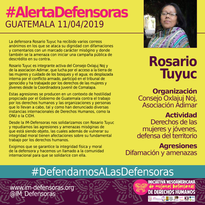 Desde la IM-Defensoras nos solidarizamos con Rosario Tuyuc y repudiamos las agresiones y amenazas misóginas de que está siendo objeto, las cuales además de vulnerar su integridad moral tienen afectaciones sobre su fundamental trabajo por los derechos humanos.