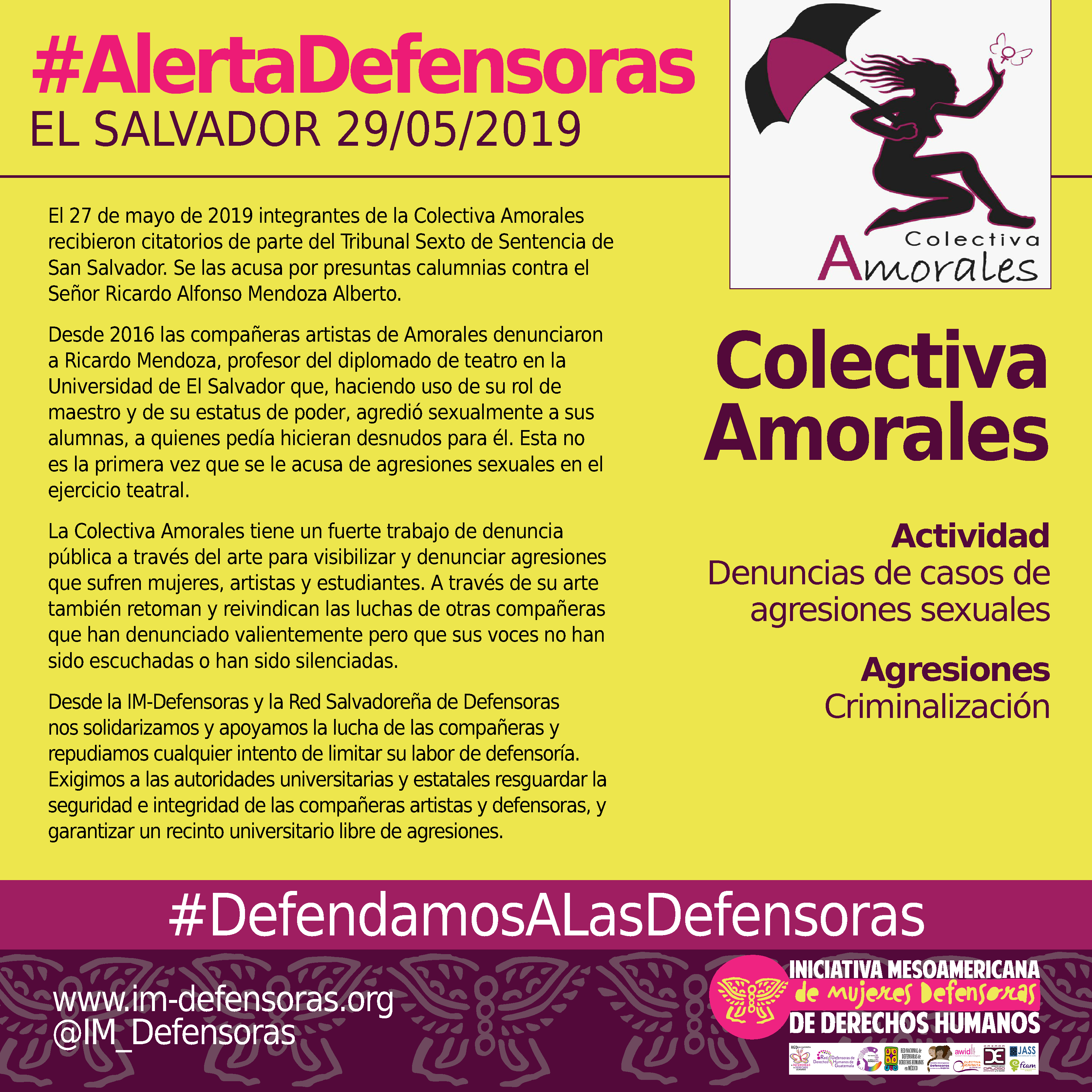 HECHOS - El 27 de mayo de 2019 integrantes de la Colectiva Amorales recibieron citatorios de parte del Tribunal Sexto de Sentencia de San Salvador. Se las acusa por presuntas calumnias contra el Señor Ricardo Alfonso Mendoza Alberto.