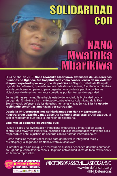 El 24 de abril de 2019, Nana Mwafrika Mbarikiwa, defensora de los derechos humanos de Uganda, fue hospitalizada como consecuencia de un violento ataque perpetrado por un grupo de policías en Naguru, distrito de Kampala, Uganda. La defensora, que está embarazada de siete meses, fue atacada mientras intentaba obtener un permiso para organizar una protesta pacífica contra las violaciones de derechos humanos cometidas por las fuerzas de seguridad.