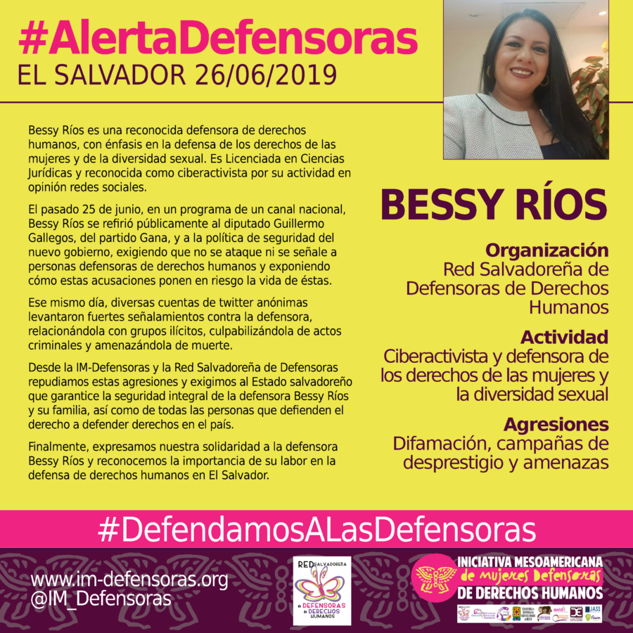 Finalmente, expresamos nuestra solidaridad a la defensora Bessy Ríos y reconocemos la importancia de su labor en la defensa de derechos humanos en El Salvador.