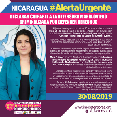 #AlertaUrgente NICARAGUA / Declaran culpable a la defensora María Oviedo, criminalizada por defender derechos