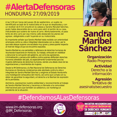 Desde la IM-Defensoras y la Red Nacional de Defensoras de Derechos Humanos en Honduras condenamos este atentado contra la vida e integridad de Sandra Maribel Sánchez y exigimos al Estado Hondureño una investigación exhaustiva del mismo, así como que cumpla con su deber de garantizar la seguridad y el derecho a la libertad de expresión de la periodista.