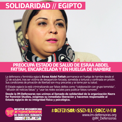 EGIPTO / Preocupa estado de salud de Esraa Abdel Fattah, encarcelada y en huelga de hambre