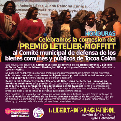 HONDURAS / Celebramos la concesión del PREMIO LETELIER-MOFFITT al Comité municipal de defensa de los bienes comunes y públicos de Tocoa Colón